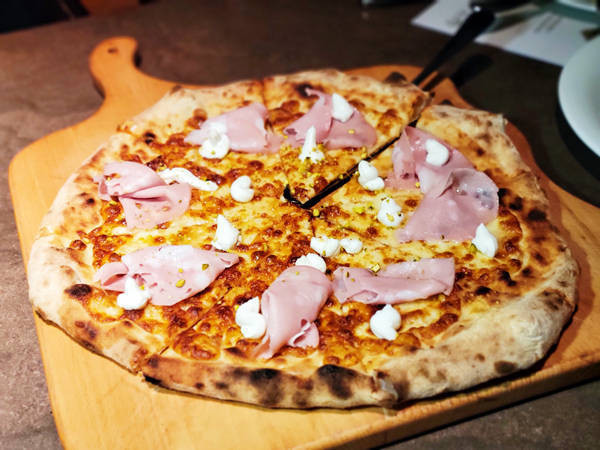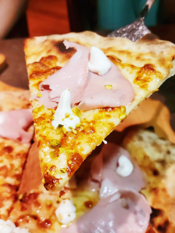 除了披萨上的芝士和肉肠很好吃外,还有苏苏未在披萨里吃过的开心果碎,配搭真的很新鲜。披萨皮的部份更是让苏苏回味,它是薄皮的但有嚼劲Q感的手工皮披萨,面团很香,边是脆脆的,苏苏忍不住口,一口气吃了两件。