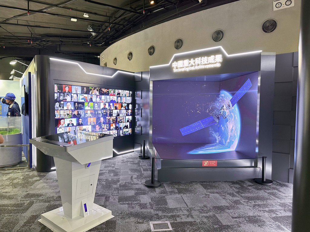 展品玩法:点触空气中成像的内容 → 选择其中一个中国重大科技成果 → 抬头观看三折幕中的裸眼3D画面 → 观看空气成像画面中的科普文字内容