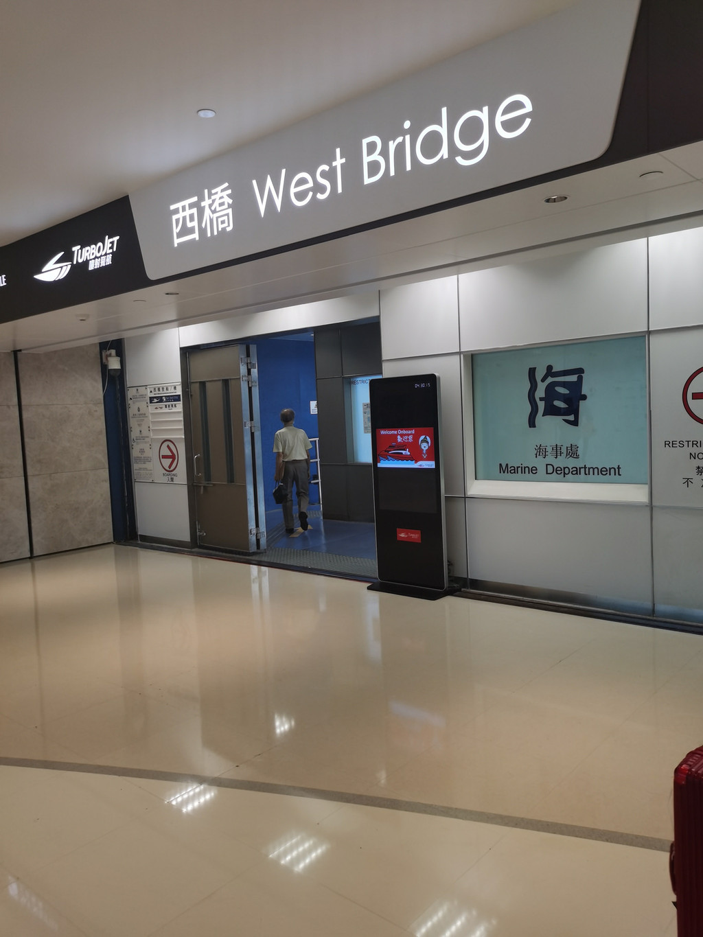 坐船去澳门交通:坐地铁“港岛线”坚尼地城方向----上环站D口出,直接上3楼,有“珠江客运”可以买票,买了票的直接走到图片上的西桥从这个门进去,记得进到检票大厅要换这个红色的号码,留心听广播以免误船。