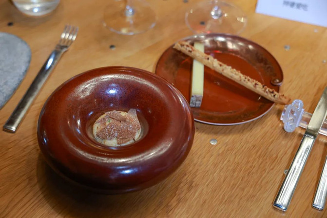 法国传统Vichyssoise,本来是一道土豆韭菜汤汁,结果被他们做成烤冻。这道菜配酒“Blanc Etc...”,为了坚持自己独特的酿造方式而手动降级的“无名名庄”,著名的隧石古早款。