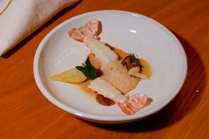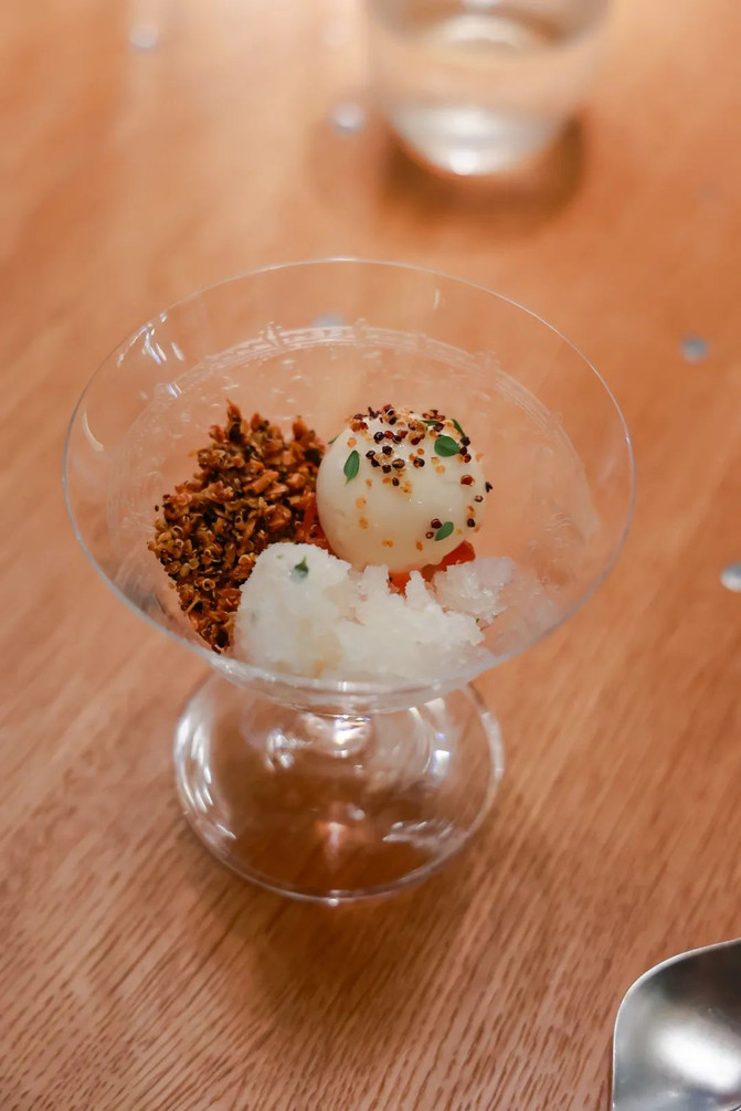 第一味是荔枝木炙烤,吃起来有种blackpink感的烟熏甜;第二味是油封,在特级初榨橄榄油中加入柑橘皮、沙捞越黑胡椒、迷迭香和百里香,55摄氏度烹饪,上面撒上虾壳粉,酥脆的虾腿,佛手片和鲜花,吃半熟甜糯感;最后一味,是锦上添花的红魔虾塔塔,佛手柑与综合柑橘香草调味,原虾虾酱淋汁。如果虾界与神界相通,这就是虾界“三位一体”吧,值得我这种凡人在嘴里发出一声悠长的“唔~~~”!