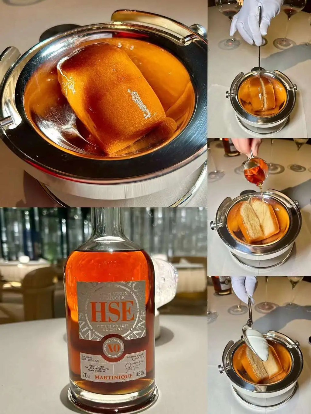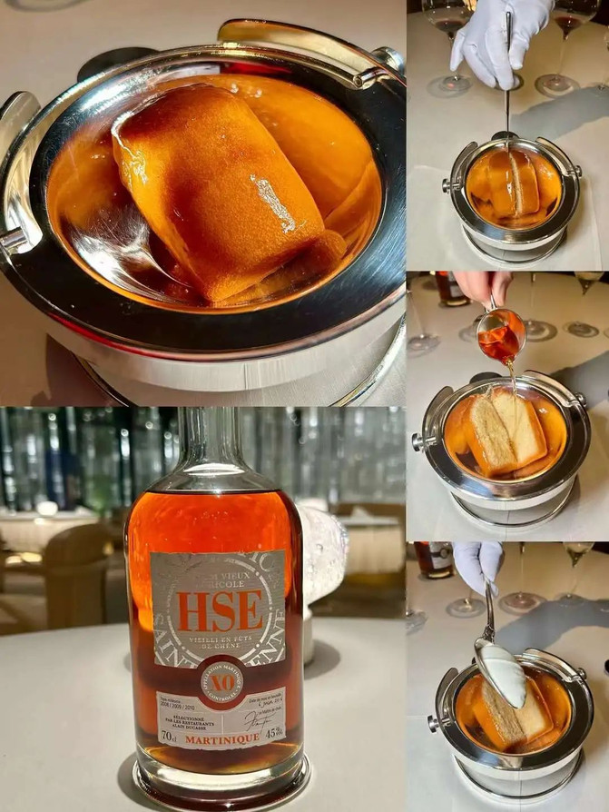 甜品本来格外出色,再搭配亨利吉罗酒庄珍藏的香槟葡萄汁+白兰地甜酒,索来拉系统,仪式感十足。毕竟蒙地卡罗朗姆酒蛋糕“Rum baba”也是杜卡斯餐厅历史悠久的名作,轻轻切开,如敞开金红色头发美人的胸脯,妩媚、香软入心。灵魂HSE朗姆在市面上很难见到,08、09与10三种年份blend,而且该家族特别为杜神做的联名款才是我眼前桌上那款。最后一勺香草生奶油,本打算浇熄烈酒诱惑,结果又奶又猛,真是不依不饶,折磨人。
