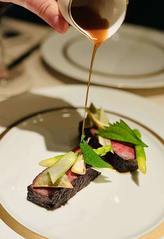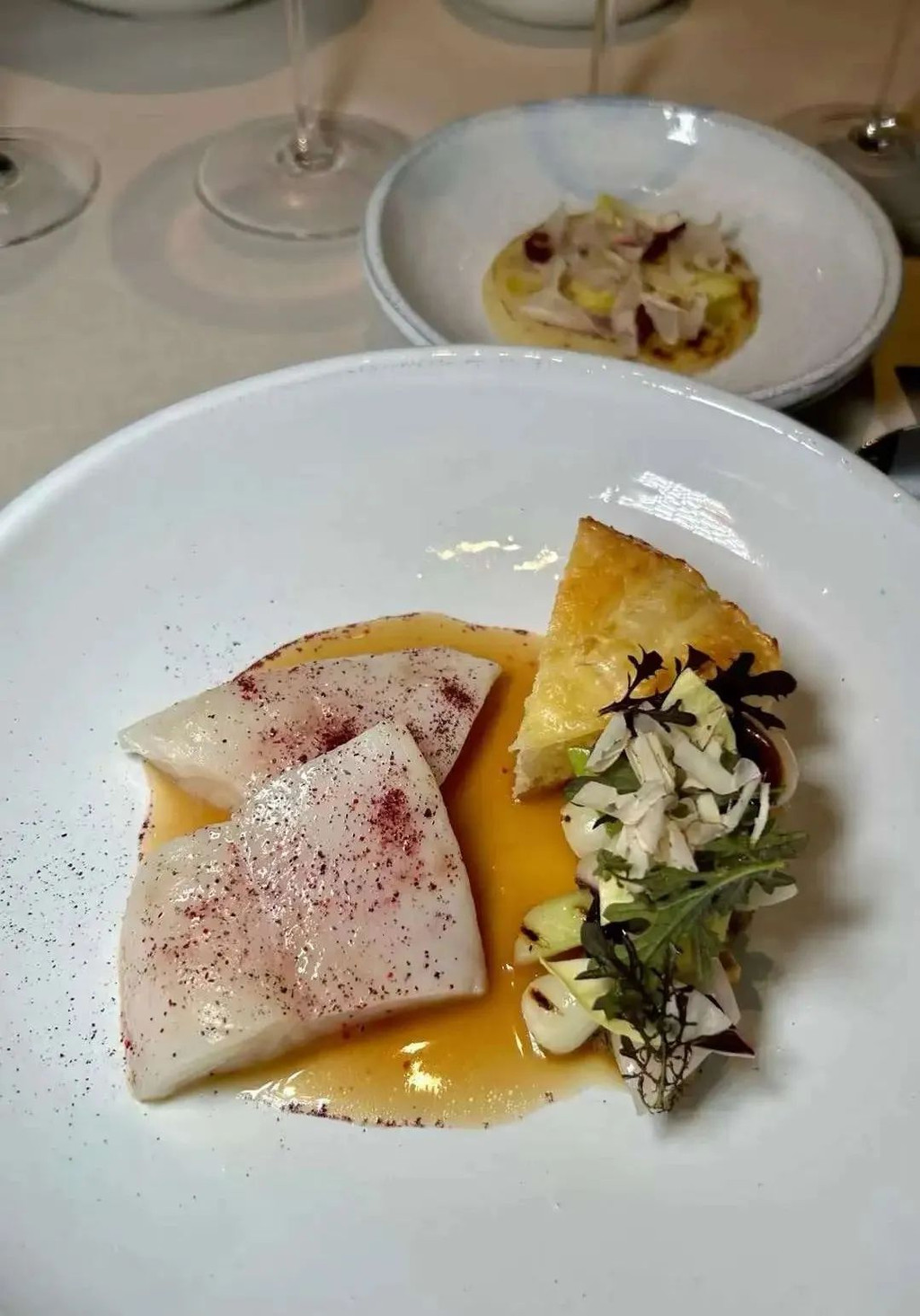 勺子一翻,见碳水被换成红菜头颗粒,我慌了,那该有多难吃…尝试后才惊喜,主厨巧思,煮+酸+烟熏轮番“抽掉”草味后,成就了这份我最爱不释手的红菜头料理。普罗旺斯松露只是迷倒人的最后一把稻草…我在两个酒单里选了侍酒师推荐的便宜塔斯马尼亚黑皮诺,而没有喝比较熟悉的Gevrey-Chambertin一级园,那丰富花香配红菜头可真有趣。