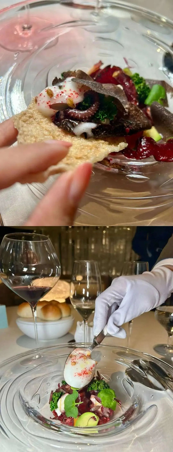 加一勺高耸的特供版Beillevaire黄油,这画面滑到我心里,只能暗喊一声“完了”。幸好这里从侍酒到服务的团队都超专业。我真的边吃边虚伪声称“好怕碳水”,只见菜单下一道是烩甜菜头、八爪鱼、牛油果与法国麦米,连忙脸红去商量,可不可以去“碳”。这样,我至少可以心安理得吃完。