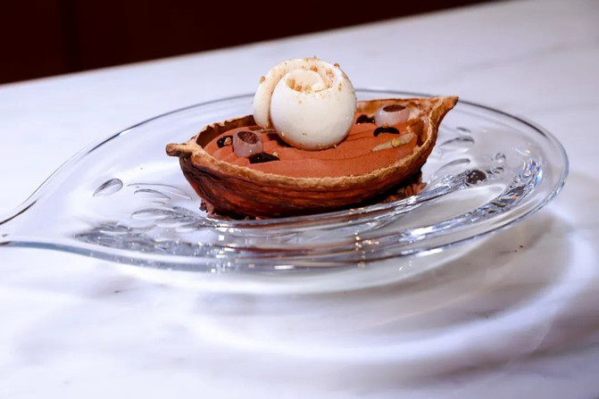 巧克力的表达有两面,一面可以是可可沙冰加酸奶酪的清新,烟熏微苦味解腻。另一面,就是早上骗我起床的那块该死的“外脆里糯”巧克力蛋糕!巧克力酱丰腴魅力十足,糕体湿软。那巧克力来自Alain Ducasse自己的工厂。一日之胖不止在于夜,更在于晨!