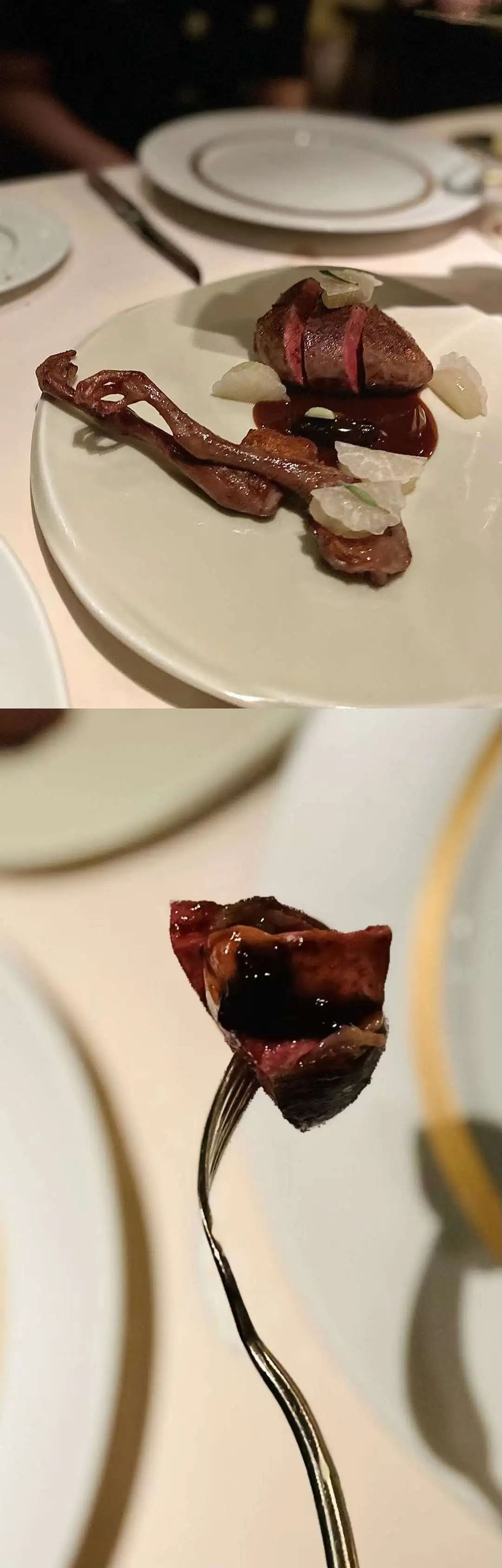 鸽子,这个食材我其实已经吃到厌倦了。他这次出品工艺复杂的油封,值得饱餐后仍垂涎。滑嫩鹅肝酿入肉芯,鸽腿历经炭烤,李子酱完美组合烟熏的奇妙香气,满分周正。我喜欢此后来一口风干猪脸肉raviolis里,一满勺八种蔬菜无水添加纯汤,清冽微甘。