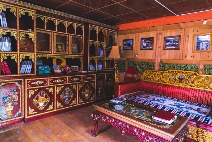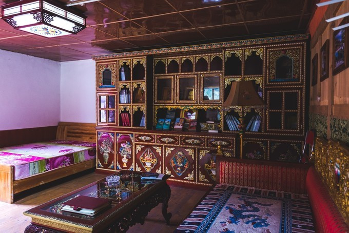 书房室内宽敞明亮, 藏式装修的墙上挂着许多照片, 记录着阿来的成长和创作足迹。漂亮大气的藏式书柜里, 放满了阿来老师出版的各种书籍, 不但有汉文版的, 还有多种外文版的。此外, 书柜上还摆放着部分获奖作品的奖杯及奖牌照片。