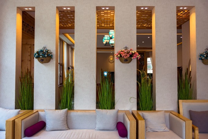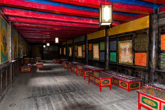走廊上为仿汉式栏杆以及花格窗, 门、窗、梁、柱上布满了精美的传统民间雕刻和彩绣。