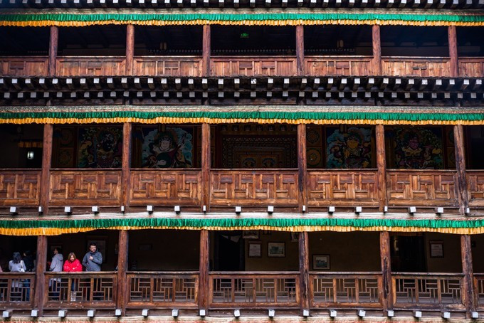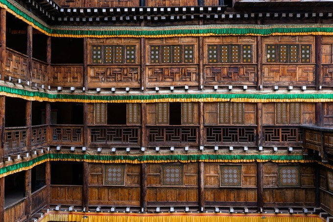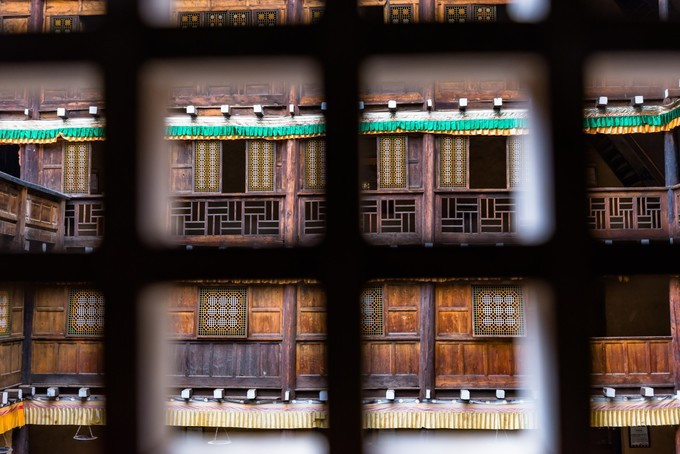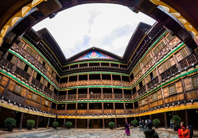 中间为占地1400平方米的天井,天井周围由宽大的木质回廊连接各楼的正厅和左右厢房。回廊由通顶廊柱、楼板和木栏杆组成。廊柱与每层的楼板、梁、枋相互衔接, 未用一钉一铆。