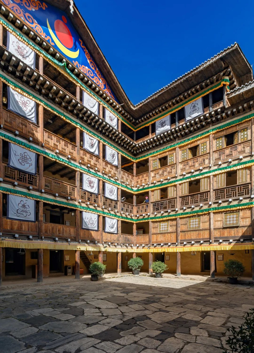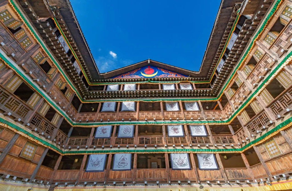 这是个仿四合院,带着天井的五层结构院子,每一处都彰显着藏汉民族精湛的建筑精华,体现了嘉绒藏族的风格;