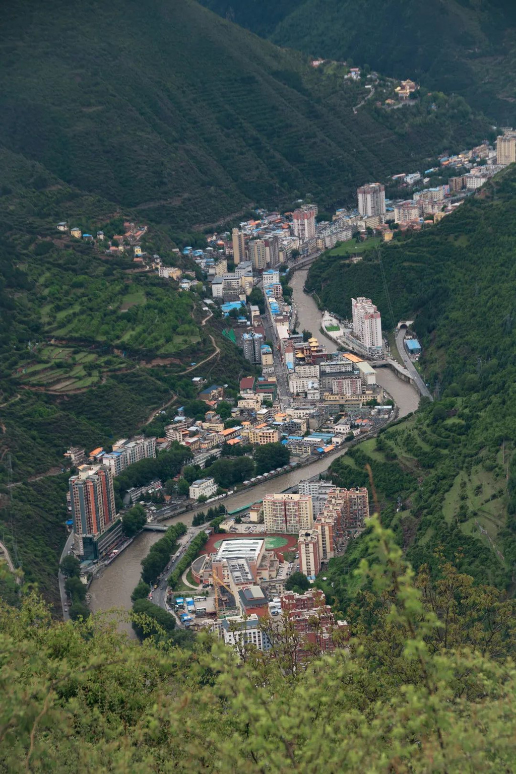 站在山顶上,俯目眺望山下的城市——马尔康,这座美丽的城市处在狭长的山沟中,梭磨河从城市里穿流而过。