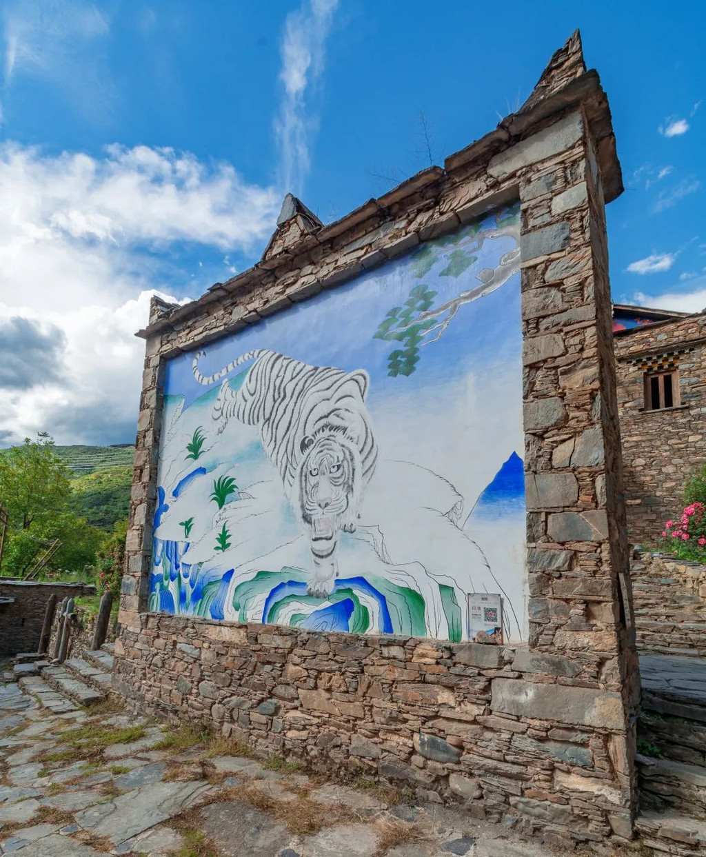 从大门进去,第一眼便看到了一面巨大的石壁,石壁的正反面各绘着白虎与麒麟,腾云驾雾,栩栩如生。