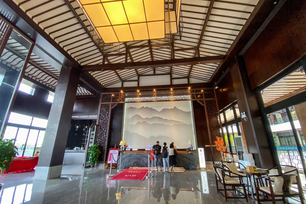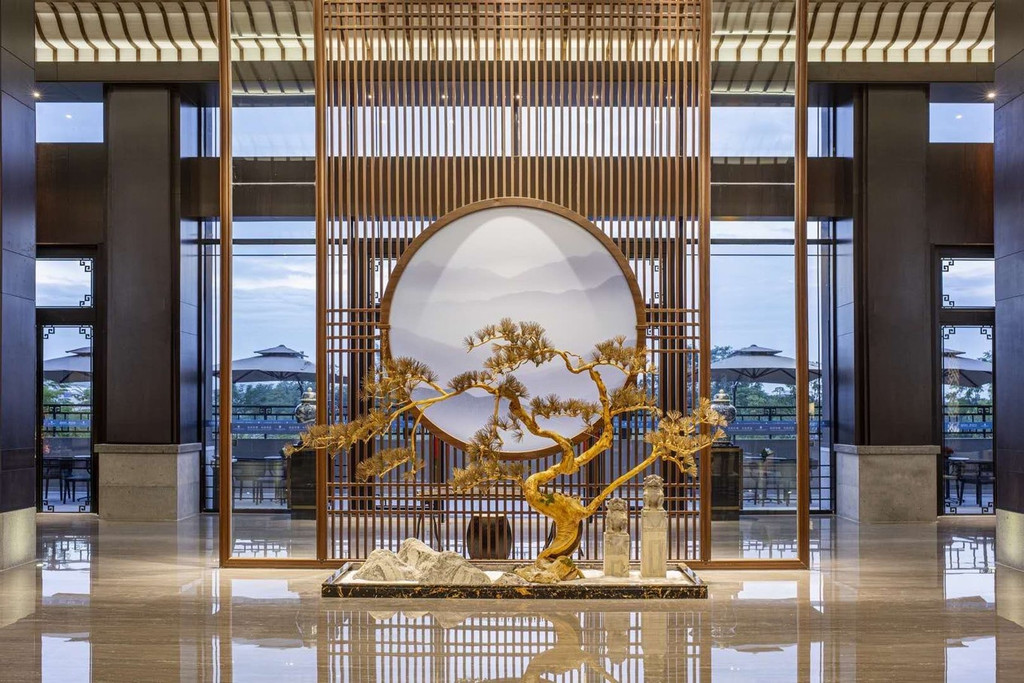 大堂空间极大,装修和布置也用了很多传统的特色。正中央的 大理石屏 风上的水墨画很有一种秀气的感觉,加上精致的木雕,已是一幅颇为精致和大气的艺术品。如果在这里仔细看看,更能看到门上那黄铜雕刻而成的 狮子 门环,能看到那摆放在墙角的孔雀宫灯,都仿佛穿越了时光,来到这个别致的酒店当中。