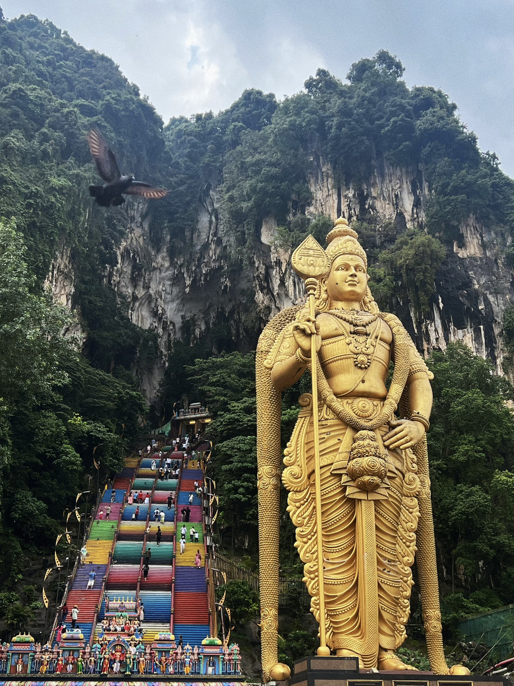 喝到心满意足,前往吉隆坡另一个名胜、也是印度教圣地的黑风洞。去之前确实期望值其实并没有很高,毕竟听说那里乌鸦猴子和蝙蝠凶猛之余,还散发出一股恶臭。但是当我们亲临其下,仰望这座大佛的时候,还是发出了惊叹——这座佛像是战神室建陀神像,也是世界上最高的室建陀神像,人的身高估计只能相当于它的一根手指。室建陀战神象征着战争与勇气,传说中是打跑黑风洞妖怪的神,他伫立在山洞之前,像这座山的守护神,守护着山里的无数生灵。两百多级彩色阶梯我们看着就腿软,没上去,所以洞穴里的气味和神秘也就随之与我们无缘啦,但是作为一个宗教圣地,这里每一处细节都透露着浓浓的印度风情,马来西亚有着这么一个地方,确实彰显了它的宗教人文包容性。