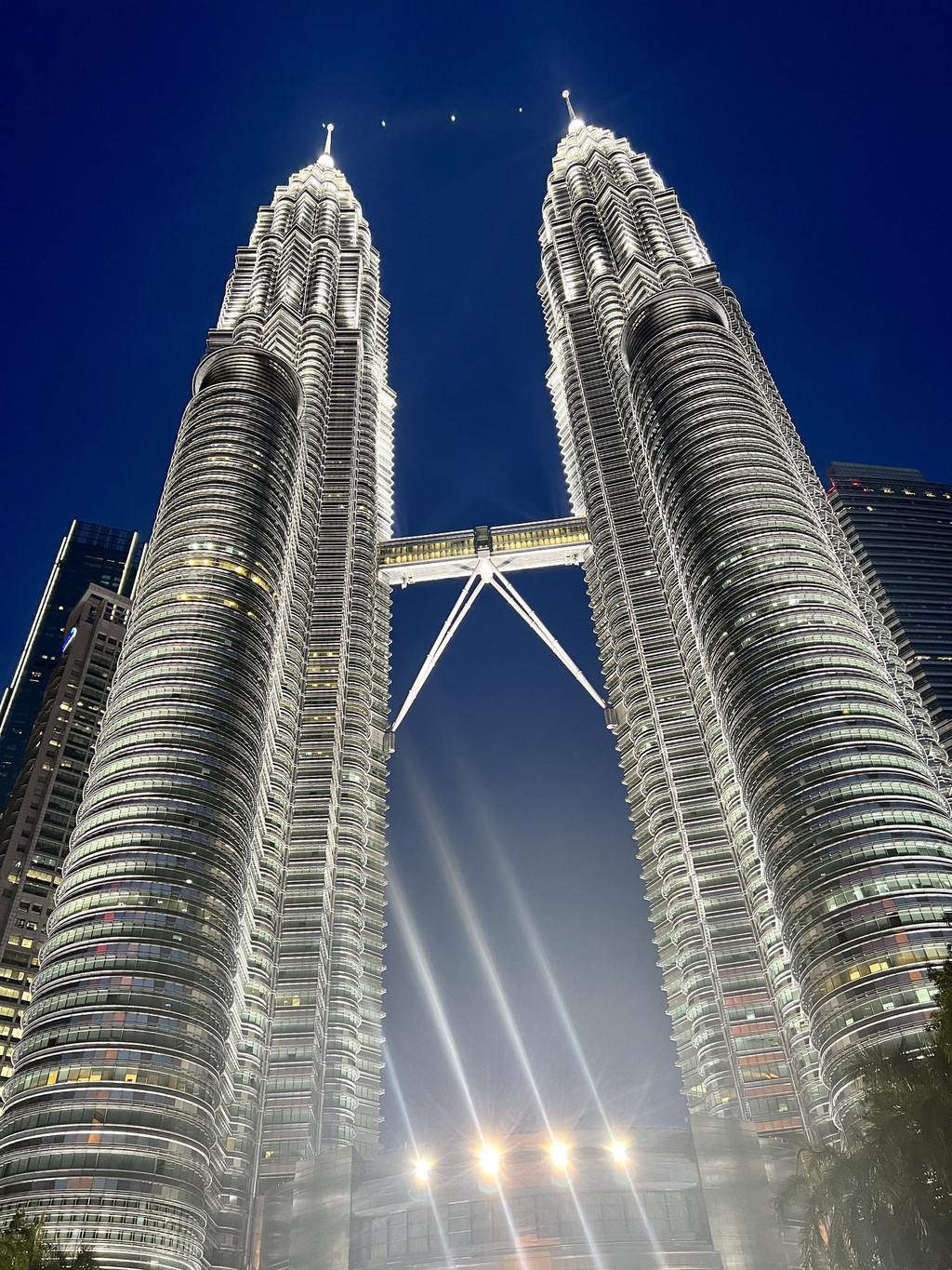最后的精华当然是留给吉隆坡乃至马来西亚最闪亮的地标——KLCC双子塔。白天的双子塔并肩高耸在市中心已然出挑,然而到了晚上,披上灯光华服的它们才是迎来自己最耀眼的时刻,恍如钻石般闪耀在夜空中,煞是迷人。我自问见过的国际城市建筑不算少数,也不禁折服于眼前这幅被双子塔点缀的夜景,久久不愿挪开双眼……更庆幸有一位给力的队友,挖掘到位于悦榕庄酒店顶楼的Vertigo酒吧,人均消费60马币能俯瞰整个吉隆坡,很难形容我们推门出室外见到双子塔尽在眼前那一刻的感受,我真的可以对着它们一整晚,这个夜晚太美妙了!