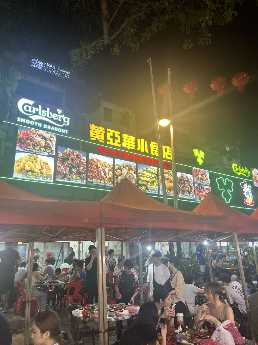 作为游客,夜晚的阿罗街是不能错过的。走在阿罗街上,游客摩肩接踵,摊档眼花缭乱,如果不是刚吃饱,绝对会犯选择困难症。然而,这条街却成为了我们本次旅程最踩雷的消费点,榴莲又贵又普通,传说中陈奕迅都来打卡的网红小吃店“黄亚华”更是一家专宰游客的黑店,招牌鸡翅烤得焦黑且平平无奇,我看隔壁桌点的魔鬼鱼他们也评价说肉柴不好吃,上菜打底半小时,价格还贵,入座喝一口自带的水都要收3rm,服务态度奇差,真不知道去那里图啥,朋友们速速避雷!!!!