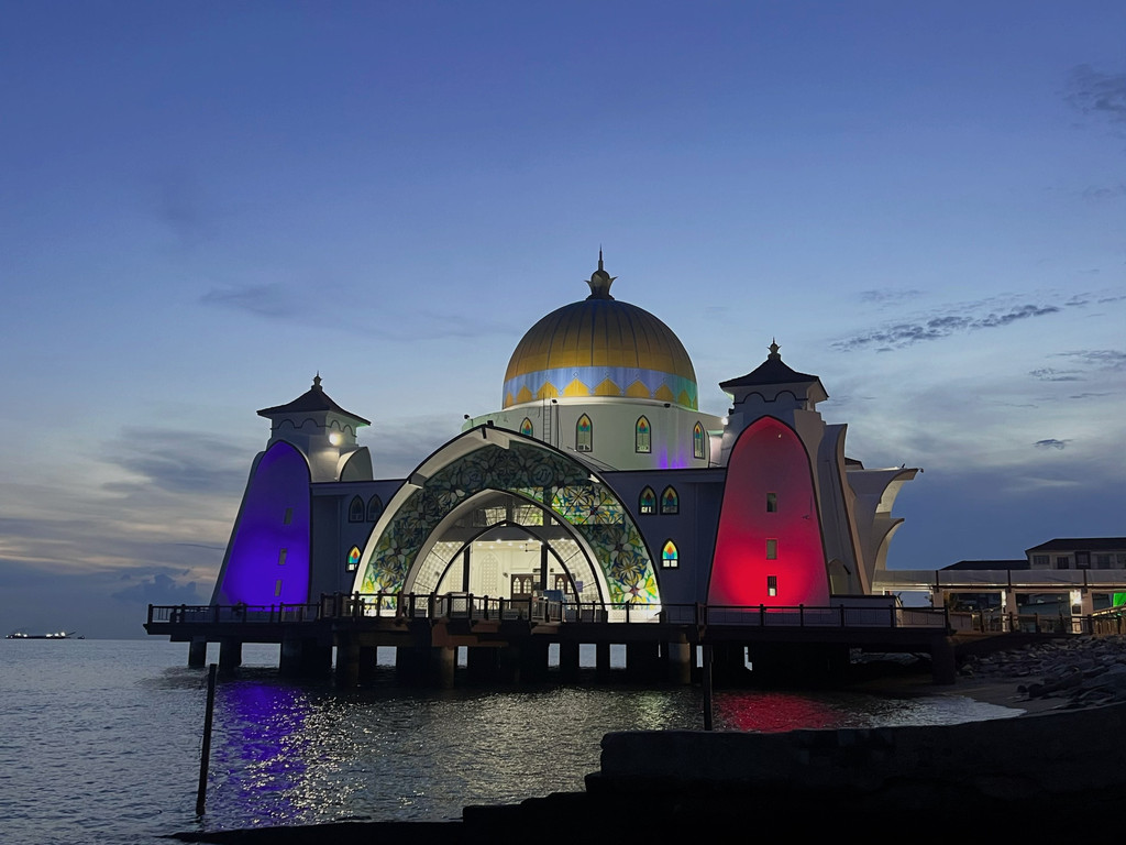 当然,在日落时分我们还有另一个很重要的任务——去马六甲海上清真寺赶日落。在这里,我们可以看到被写在历史书上的、曾经世界上最繁忙的马六甲海峡,还有海上还时不时经过的货轮,都试图写下其昔日的辉煌。这座融合了中东和马来西亚风格的建筑就像是一座漂浮在海上的宫殿一样,在粉紫色的晚霞下散发出彩色的琉璃光,在海边显得迷人、又孤独。需要注意的是,观赏这座清真寺的最佳角度并非进入寺内,而是在海边外围,跟着人群走就对了,门票是5马币,送一瓶水,超值。