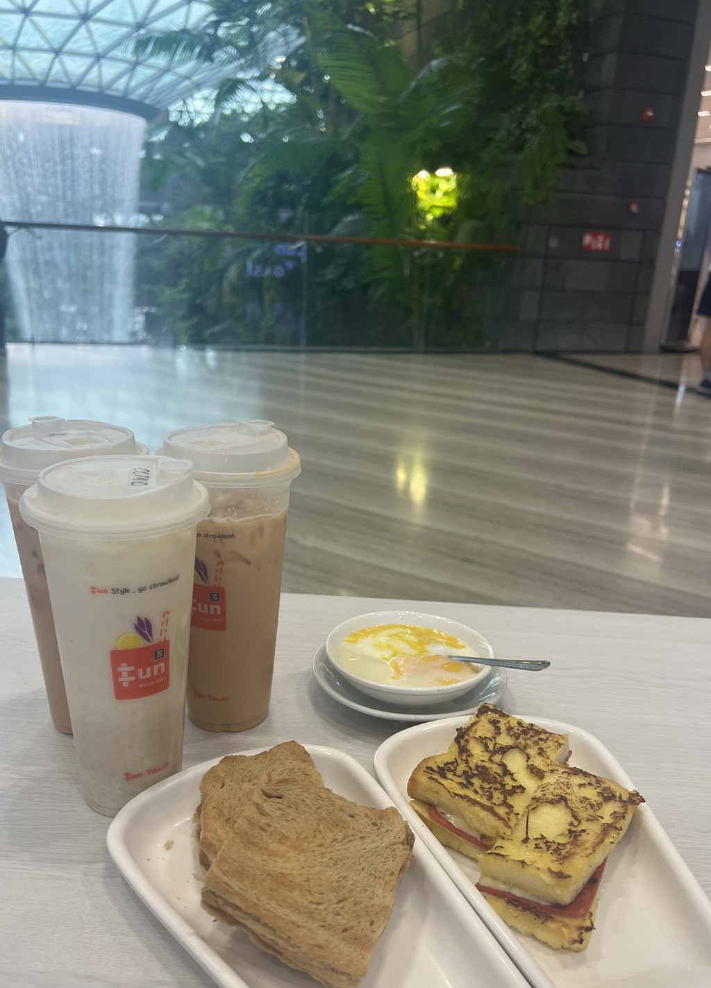 司机把我们放在了T1航站楼,如果要坐小火车看瀑布的话,需要从T1坐到T2,再从T2坐到T3,T2—T3这段小火车的路程即会贯穿整个星耀仗义,从瀑布旁边开过,非常值得体验。下了火车再进入星耀樟宜内部,打卡40米高的室内瀑布雨林景观,太壮观了!!亲测四楼的瀑布视野是最好的,在这里有一家芳Fun餐厅,吃的是亚坤同类吐司,实在是念念不忘就去下order了,味道不错,但比起亚坤还是稍显逊色了点,在这里边看瀑布边喝奶茶,抬头就能看到五楼全球独一无二的室内仙人掌花园,天啊新加坡,你还有什么惊喜是我们不知道的?