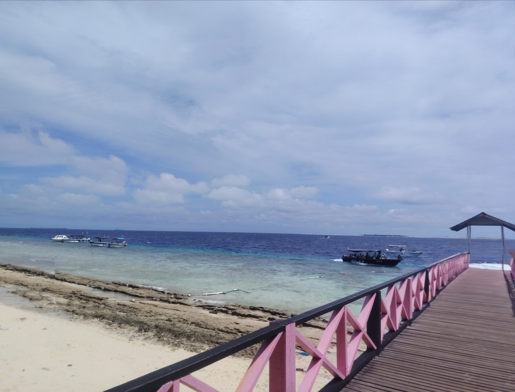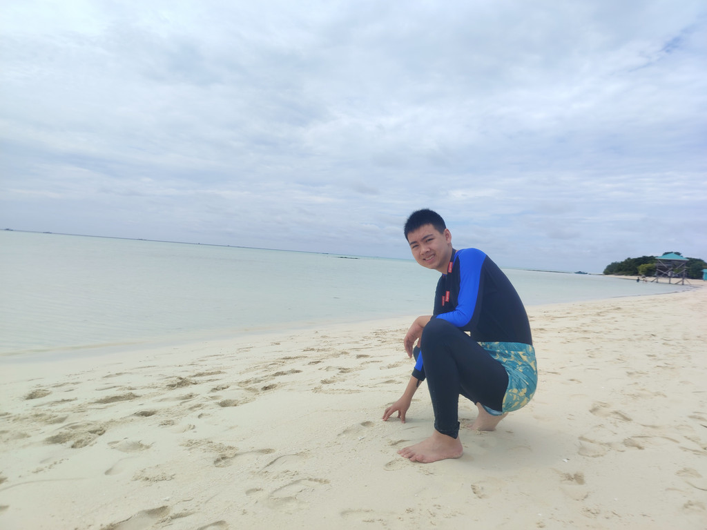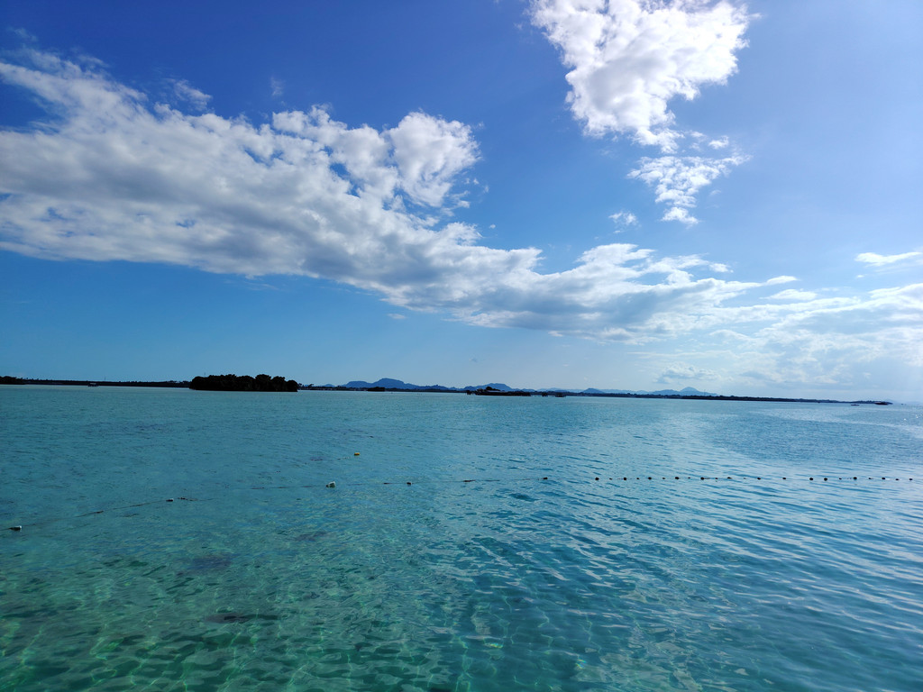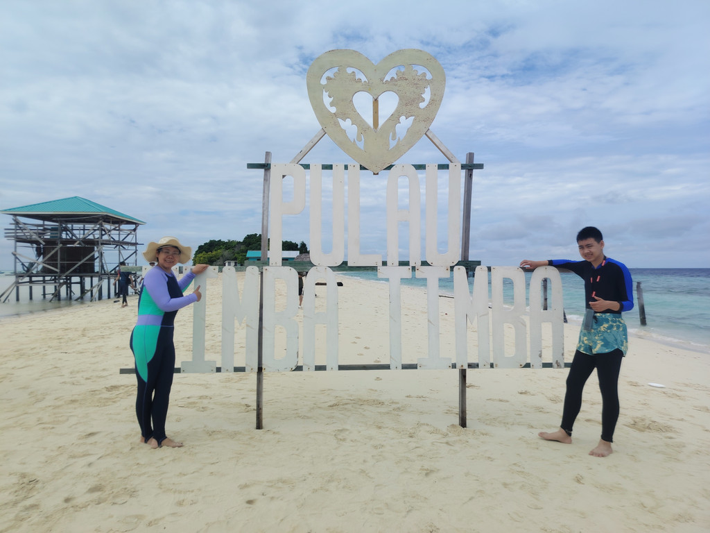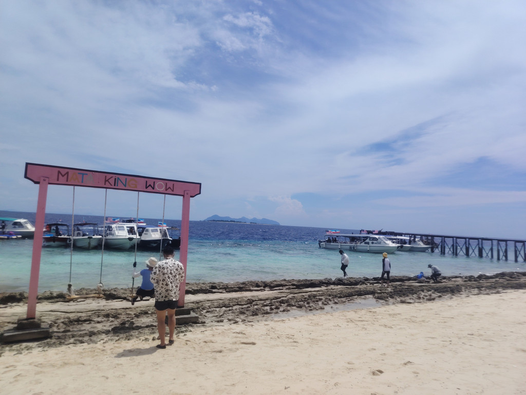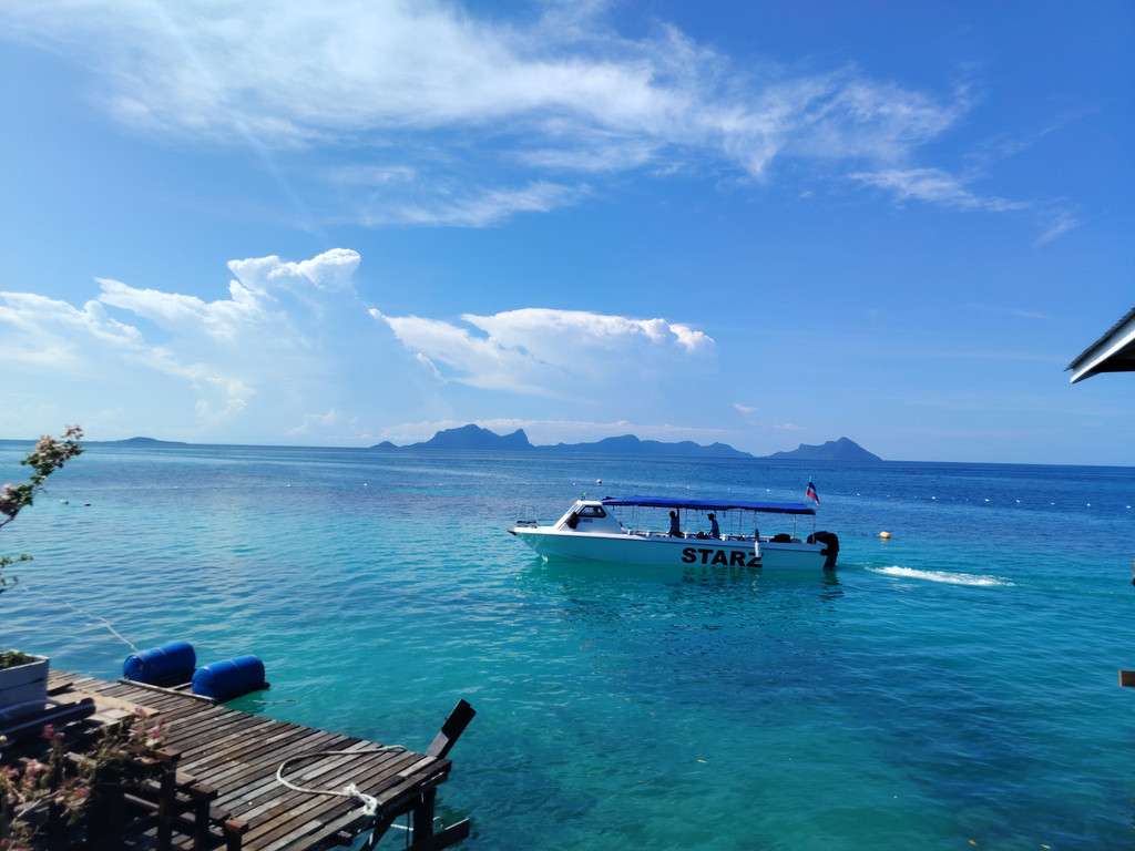 按照客服提供的日程资料,步行10分钟到达出海码头,9点整我们一行15人一艘快艇三名当地中文导游兼深潜教练,两名浮潜教练,两名辅助教练结伴出发。快艇飞驰了45分钟后我们到达第一个岛——汀巴岛,这个岛以拖尾白沙滩著称,在离船前船长和我们收取了一天三个岛的上岛费50马币(2人)。汀巴岛,沙白水清美得不可方物,七色渐变的海水在阳光的照射下就是一幅迷人的风景画。