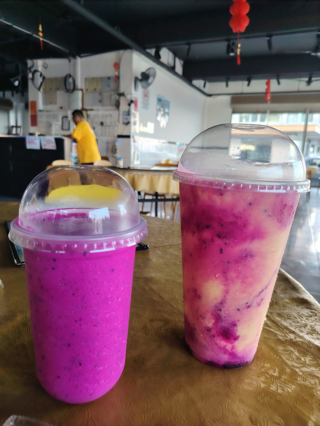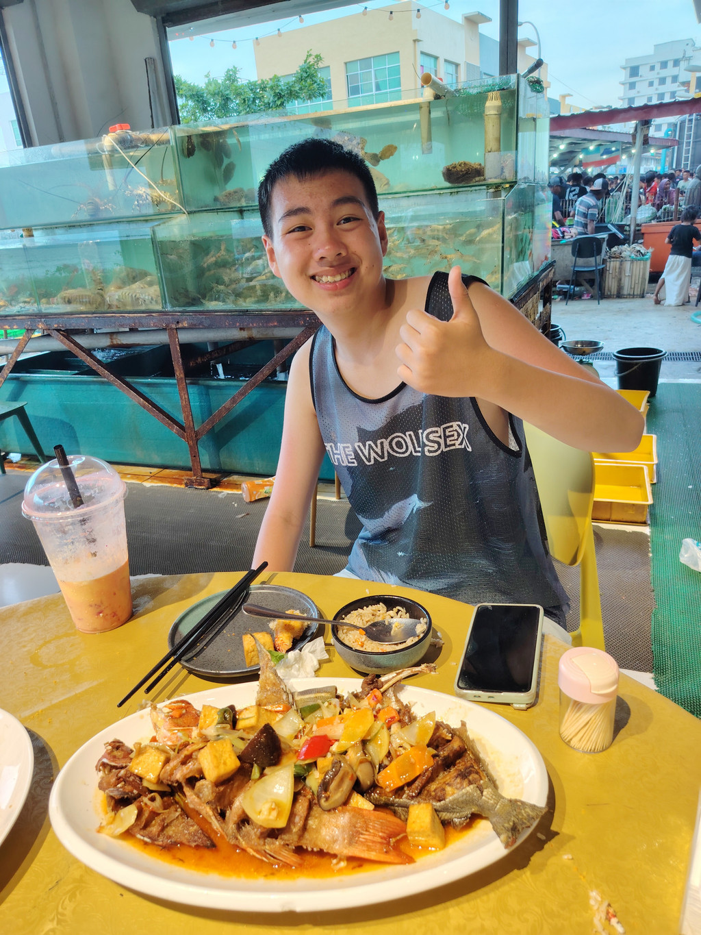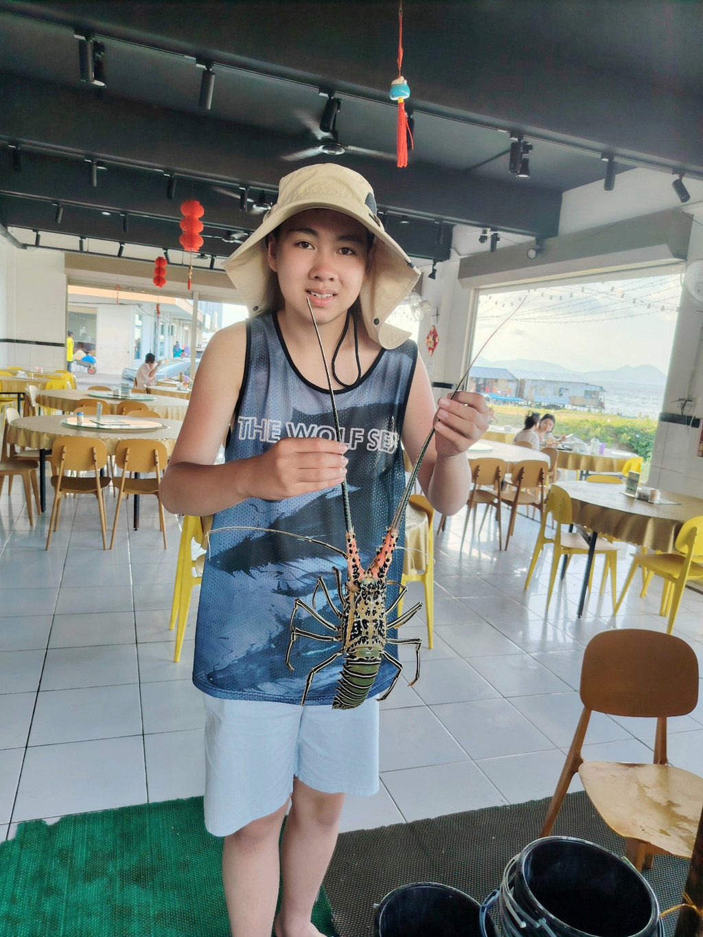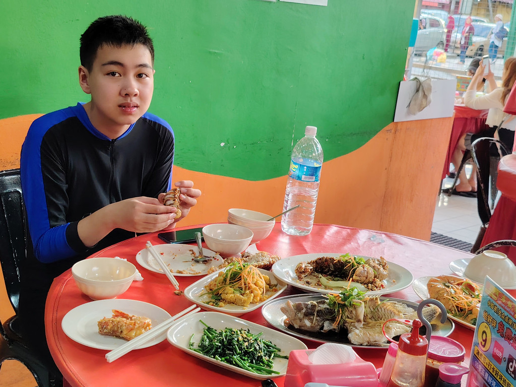 中午还是海上简餐,下午4点收杆回镇,我们的行李被船长带上船省去了回水屋再坐船回镇上的路程,一天满满的收获让大家兴奋不已,“分赃”后我们又来到海鲜市场砍价,100马币拿下只青龙,在市场边的大排档加工了当天的鱼获儿和龙虾,又要了海鲜炒饭和茄子,连加工费140元。需要打卡的是镇上的水果沙沙冰,纯水果现打,超大一杯17马币左右又去火降温还超有营养,我和儿子每天都买上一杯解馋。