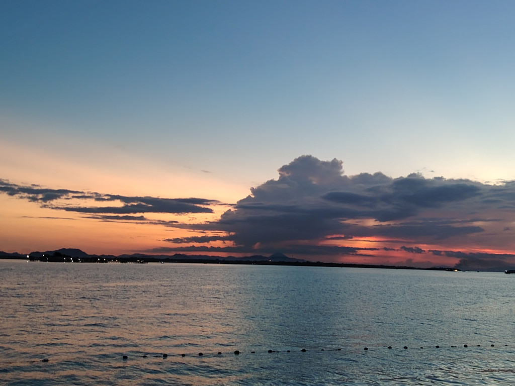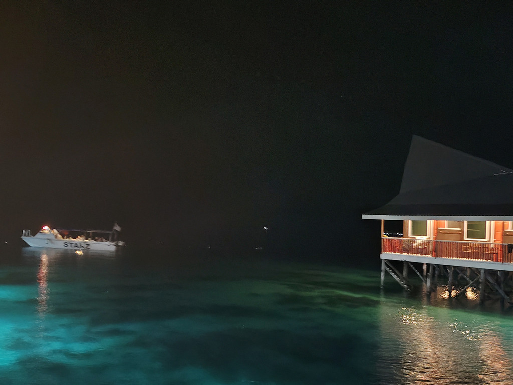 看够海龟后小哥把我和儿子拉回水屋,在上岸前的水域无数条漂亮的小鱼在和不能浮潜的小朋友们嬉戏,儿子又被鱼儿们绊住了脚玩儿了好一会。6点开自助晚餐,中规中矩,没有太多惊喜也可以吃饱,儿子和夜钓的3个男孩兴奋地盼着夜幕的到来,在超美的晚霞和无数的鱼儿陪伴下我们享用了晚餐。