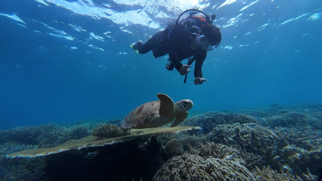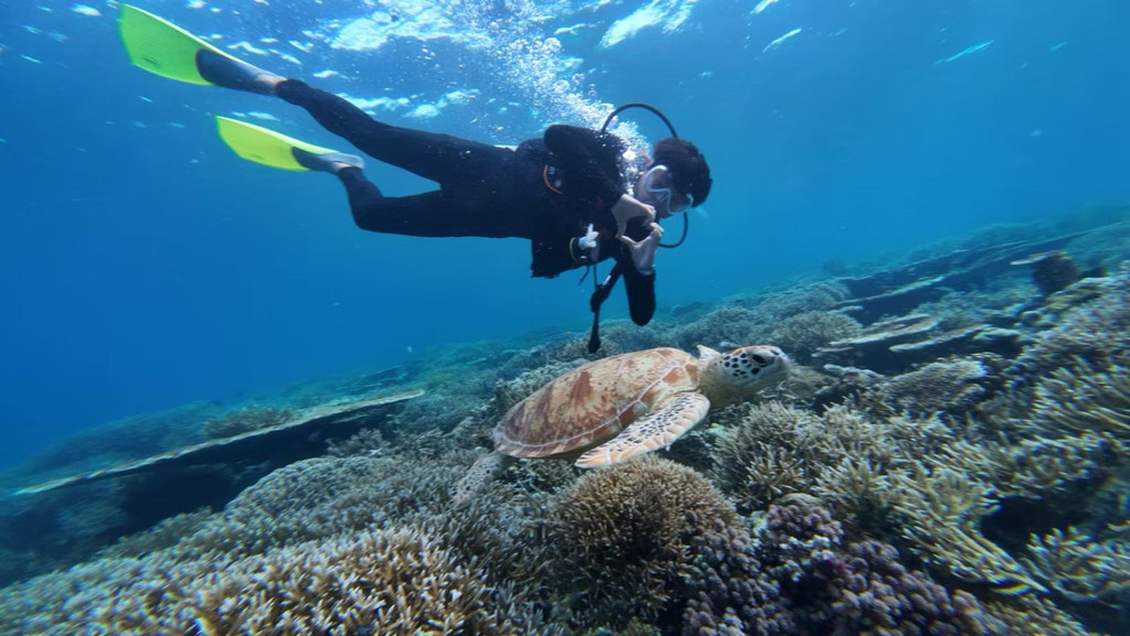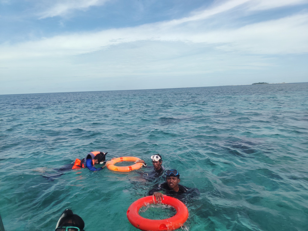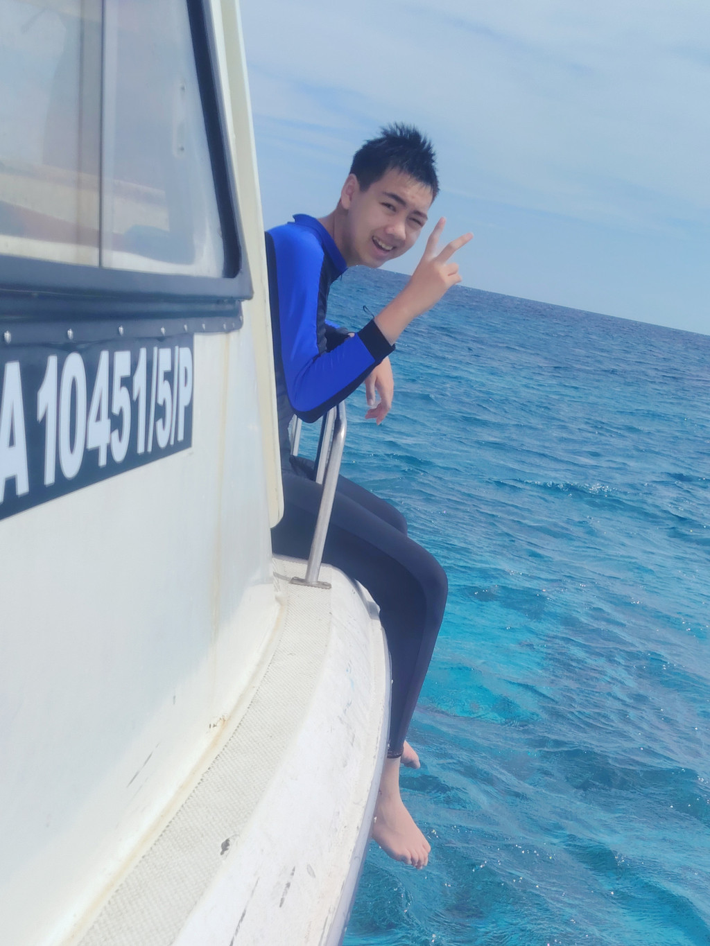 一个小时后回船去马达京岛附近开始第一次潜水,船上有10个人报名深潜,第一次是一对二,我和儿子一组,从船沿倒翻入海让我有些害怕,教练耐心的鼓励稍作调整后依照教练的指导我们顺利进入深海,教练们帮我们拍照拍视频,还是深潜可以看到更多漂亮的鱼和珊瑚,10分钟后上船,有的船友因为过度害怕放弃第二次深潜行程,我倒是觉得有了第一次的经验第二次感受应该更从容一些。12点左右我们到达第二个岛——马达京岛上岛吃午饭。
