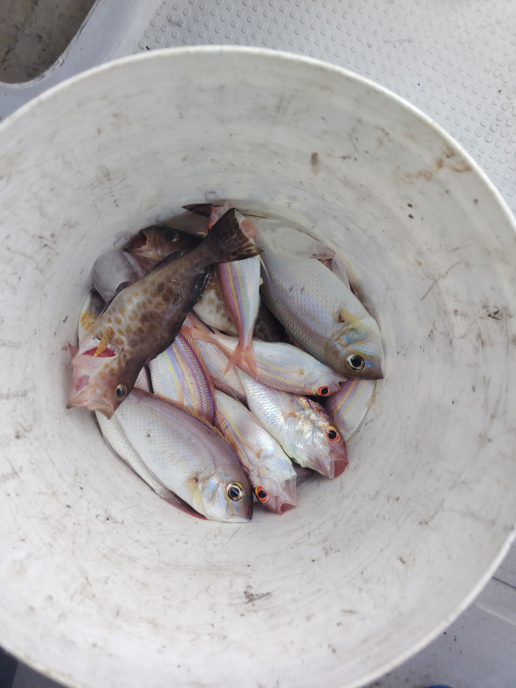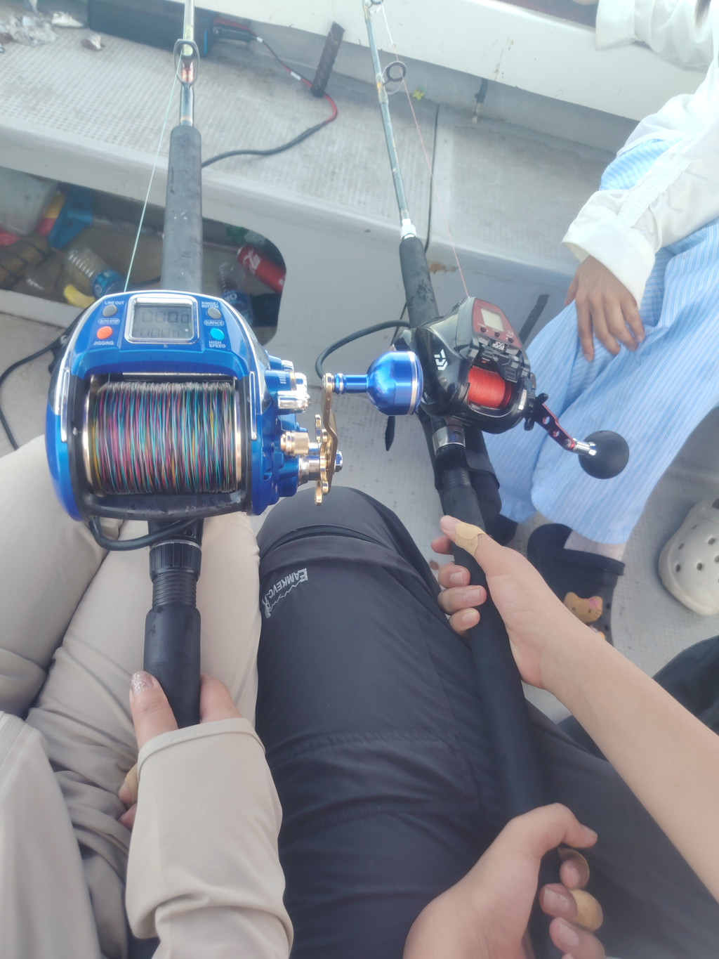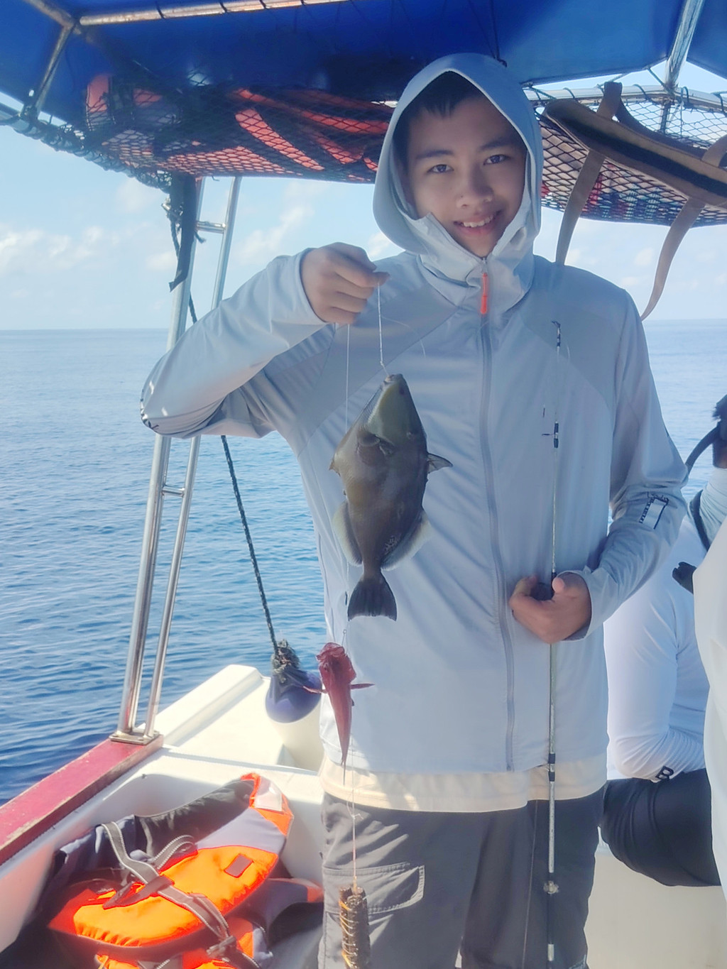 第四天,深海钓——我们定的是全天深海钓,在吃完早餐后海钓中心的船长便到水屋接我们,一行6人配了3个教练,我们的客服没有给定电绞(电绞大约是600-700元一人),儿子用的是路亚杆,我不喜欢钓鱼但不得不跟着,所以费用是一样的,追加了差价400元(2人),快艇依然开了40多分钟,船上有探鱼器可以追踪鱼儿们,教练讲了海钓方法后大家各显身手,不一会儿儿子首捷一杆钓双鱼,顿时大家的士气大增。