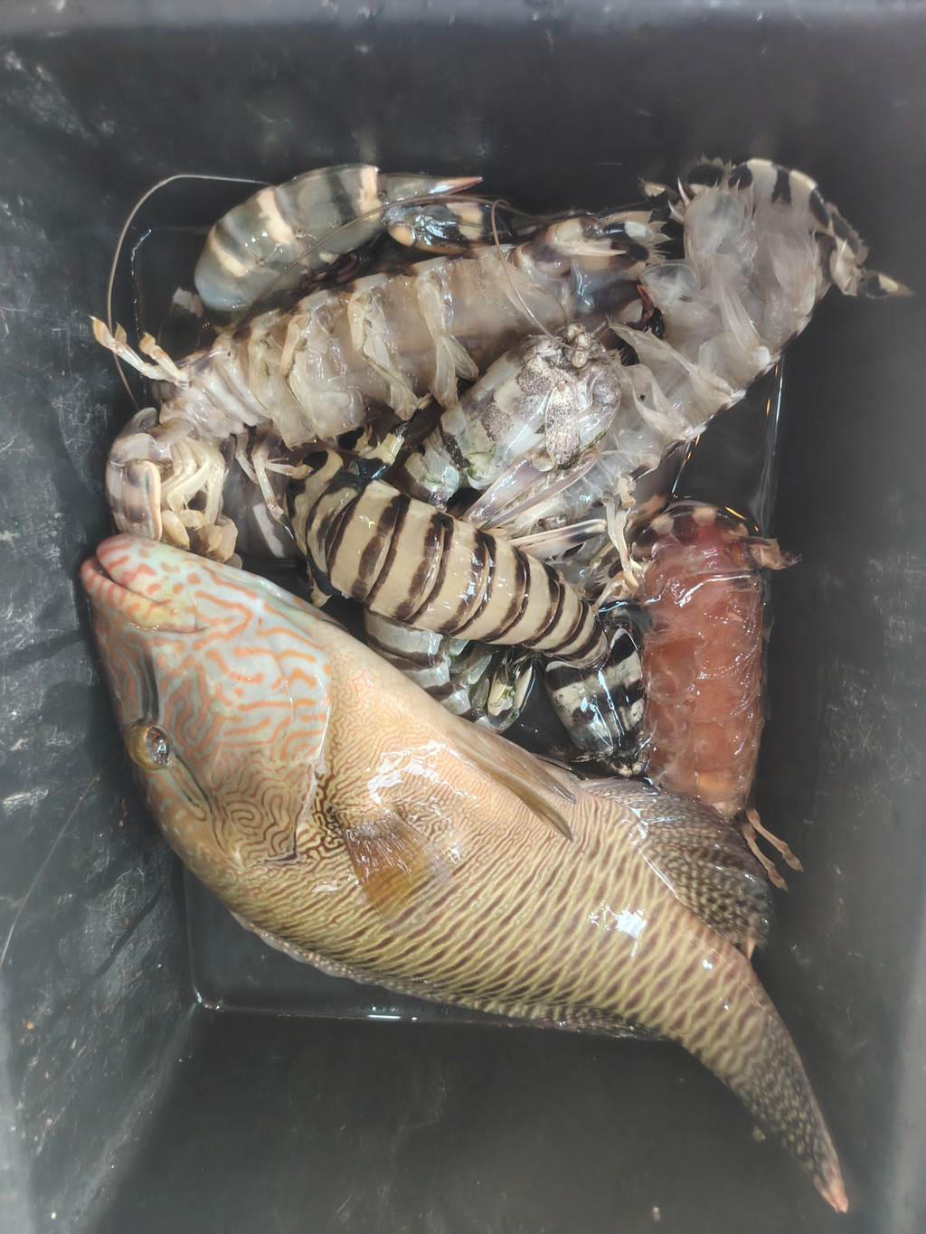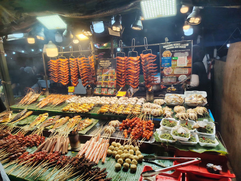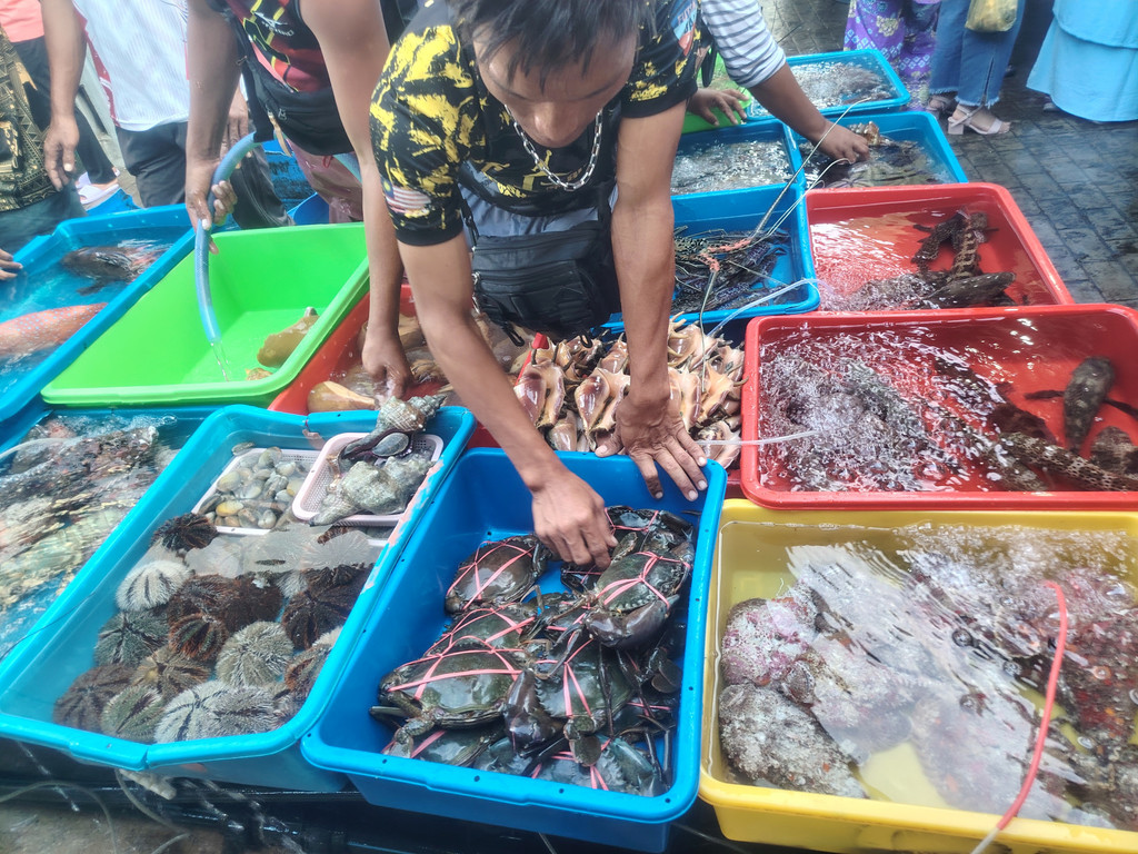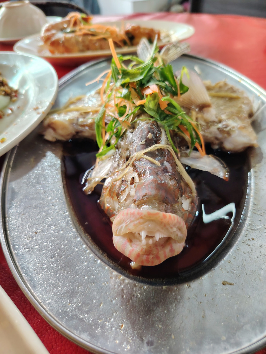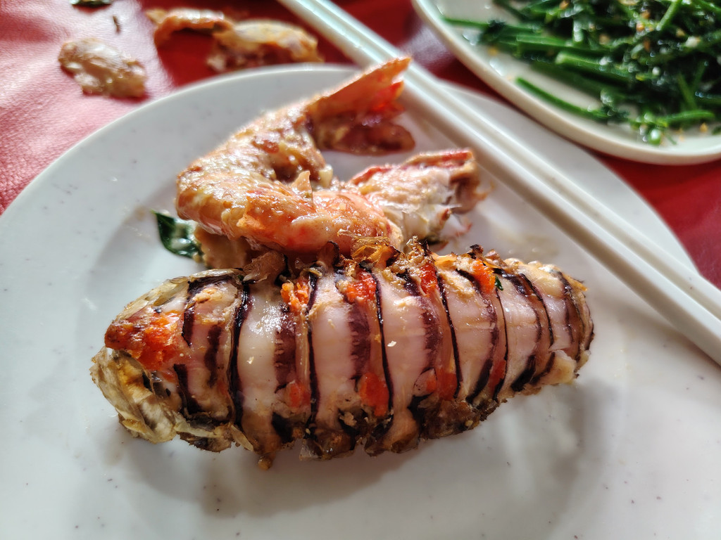 下船后和船友一起约了仙本那最强海鲜市场,酣畅淋漓的一场讨价还价仿佛比出海更过瘾,100马币划下儿子心心念念的苏眉鱼,和船友平分了120马币拿下的半臂长12只皮皮虾,60马币砍了6只超大老虎虾,带着海鲜去了一家海鲜大排档,又要了当地的青菜和蛋黄焗鱿鱼含加工费共162元人民币。