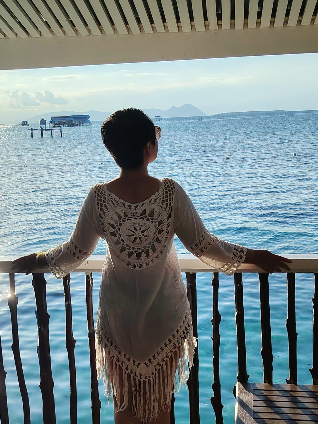水屋真是一时一幅画,美得让人窒息,早上屋里阳台下的鱼儿们已经早早的开始迎接又一天的好天气,我站在私人阳台上远眺,海天一色波光粼粼,所谓的岁月静好不过如此,玻璃海让我忘却了所有烦恼,这样的海这样的景色怎能让人不如痴如醉呢?