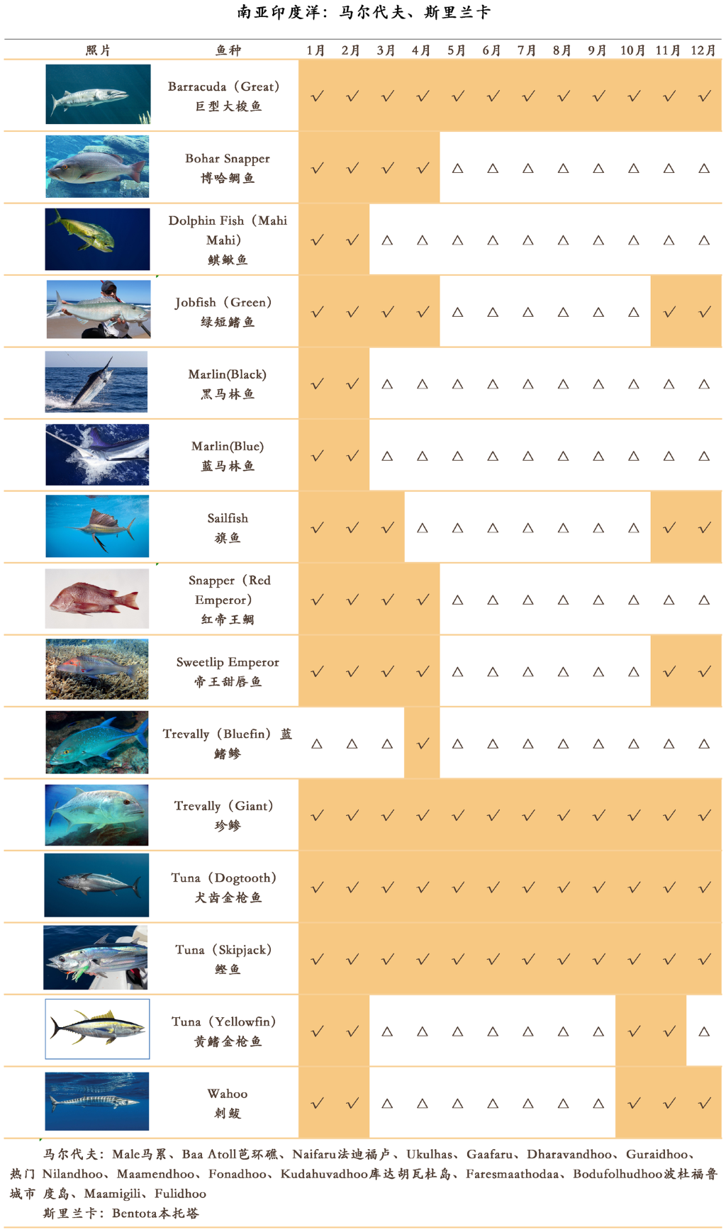 南亚大部分地区属热带季风气候,一年分热季(3-5月)、雨季(6-10月)和凉季(11月至次年2月),全年高温,各地降水量相差很大。在南亚地区,马尔代夫与斯里兰卡拥有众多的热门钓点。