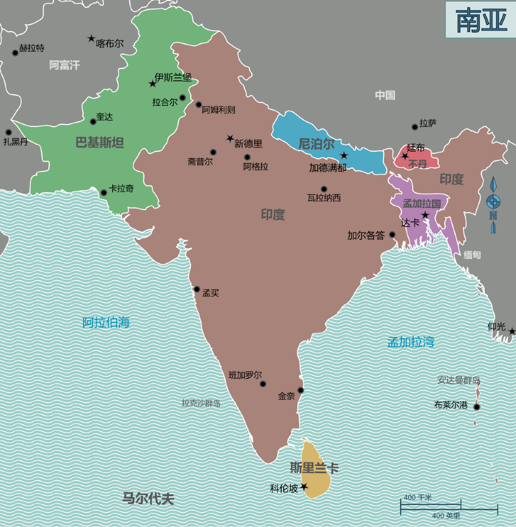南亚指位于亚洲南部的喜马拉雅山脉中、西段以南及印度洋之间的广大地区。它东濒孟加拉湾,西滨阿拉伯海。南亚区域内的国家包括印度、巴基斯坦、孟加拉国、斯里兰卡、尼泊尔、不丹和马尔代夫。
