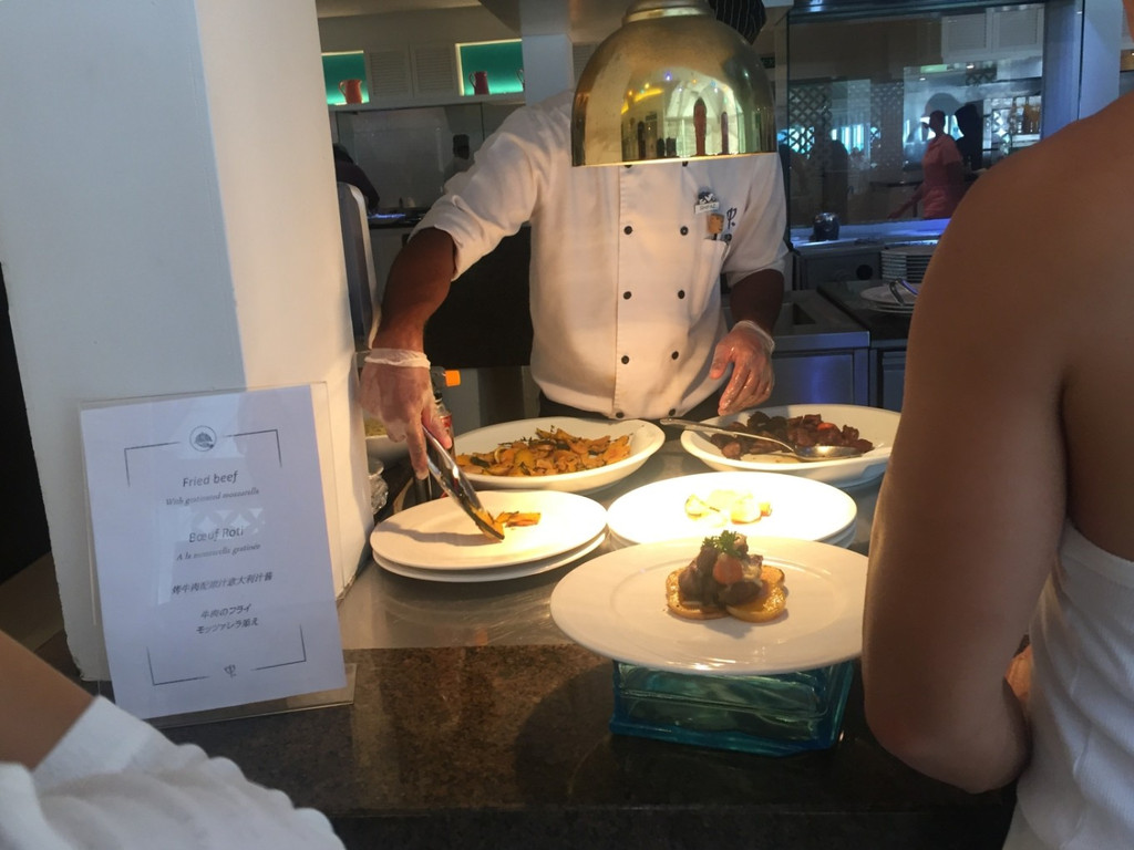我们是提前预订了坎度餐厅的,坎度有水屋的专属座位相对沙屋来说订位不算难,因为我们订的是7点,所以洗完澡就直接过去了。