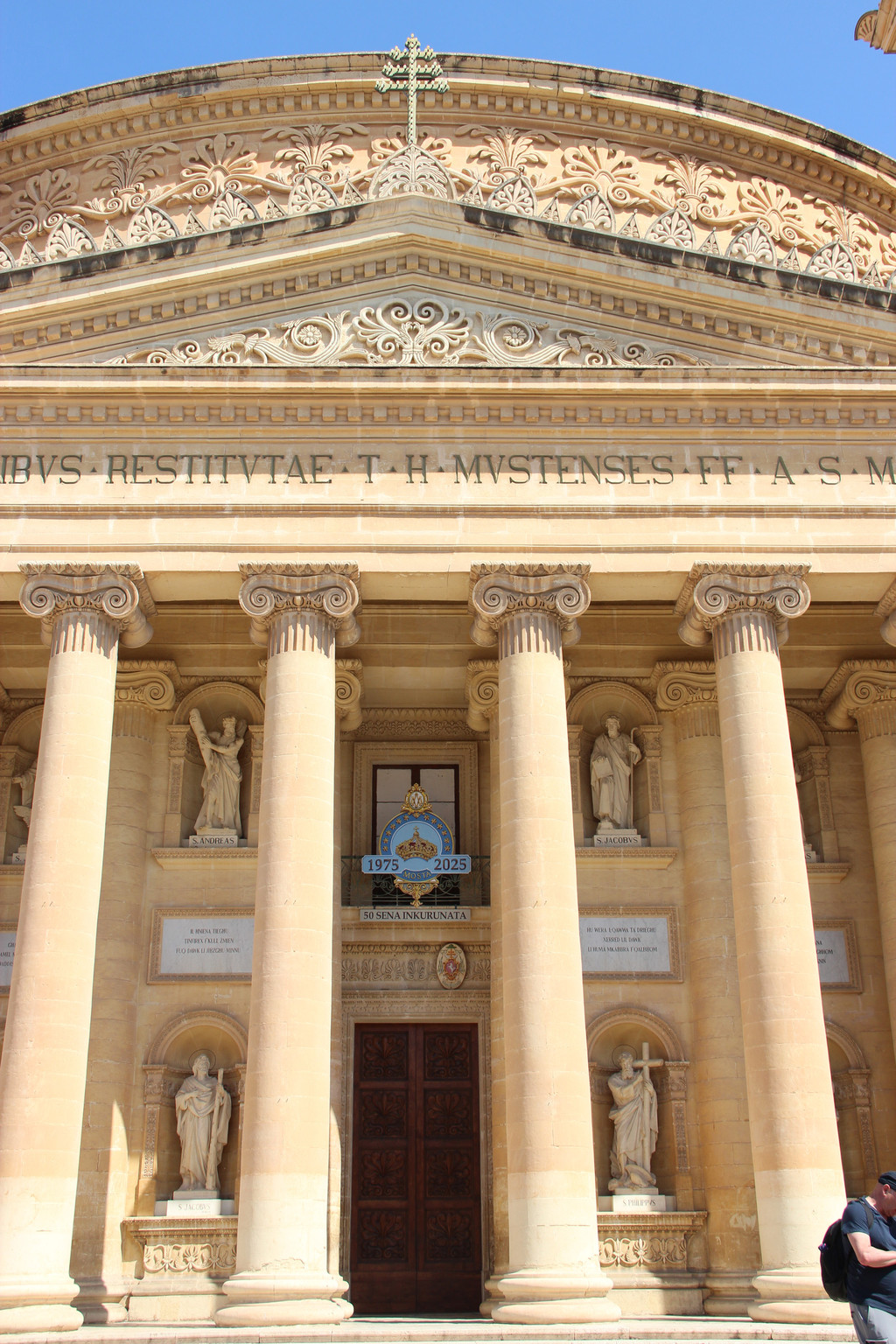 莫斯塔圆顶教堂始建于1833年,它的设计者是位并非建筑师的马耳他人。教堂圆顶的内部直径达37.2米,据说是欧洲第三大无支撑圆顶教堂。教堂墙壁的厚度达9米多,用以承载巨大的圆顶。至于第一可能是佛罗伦萨的圣母百花(45.5米),第二就是罗马的万神殿(43.3米)。