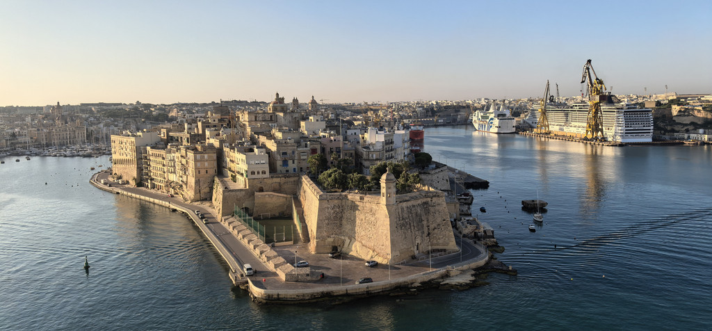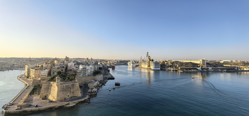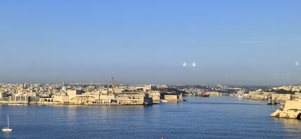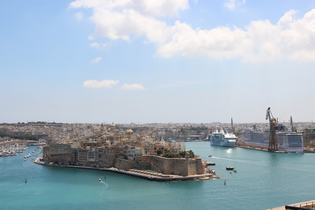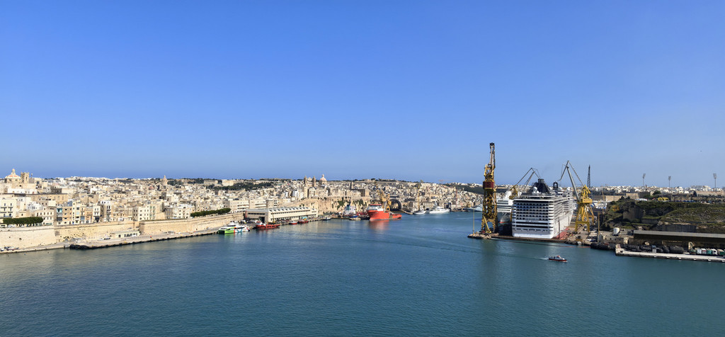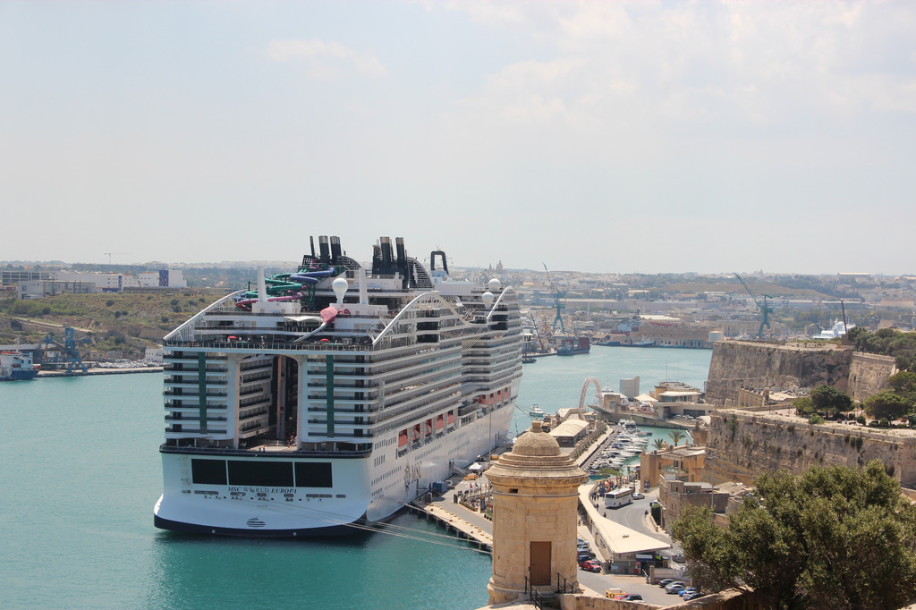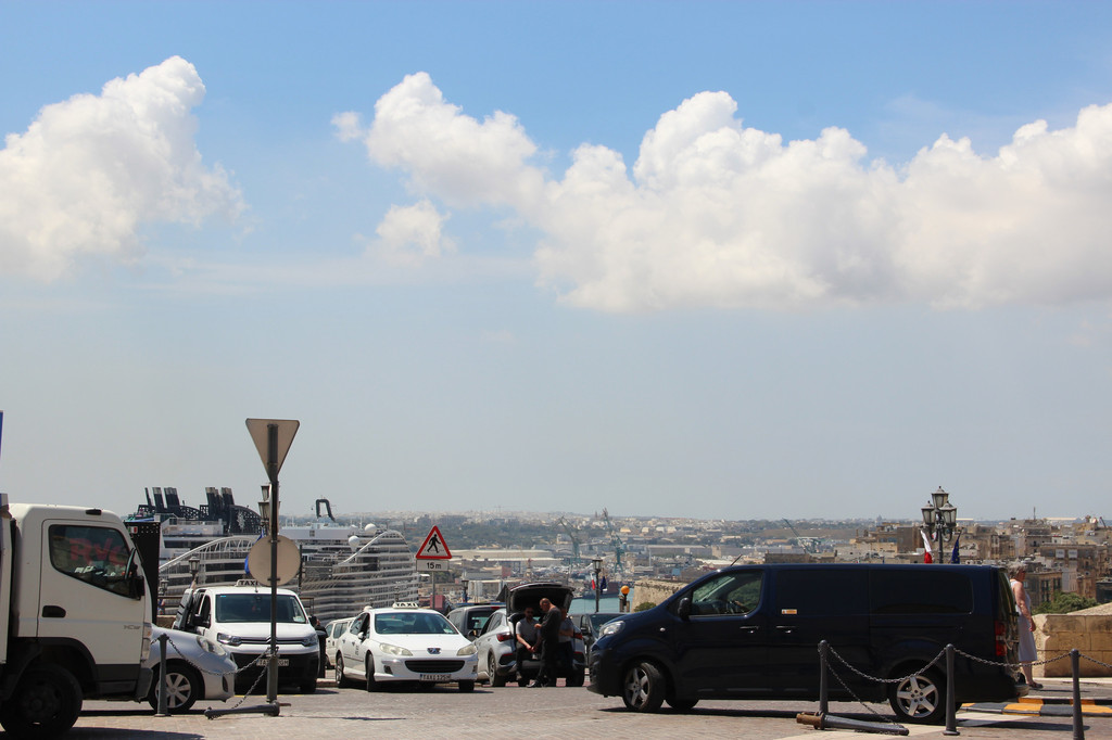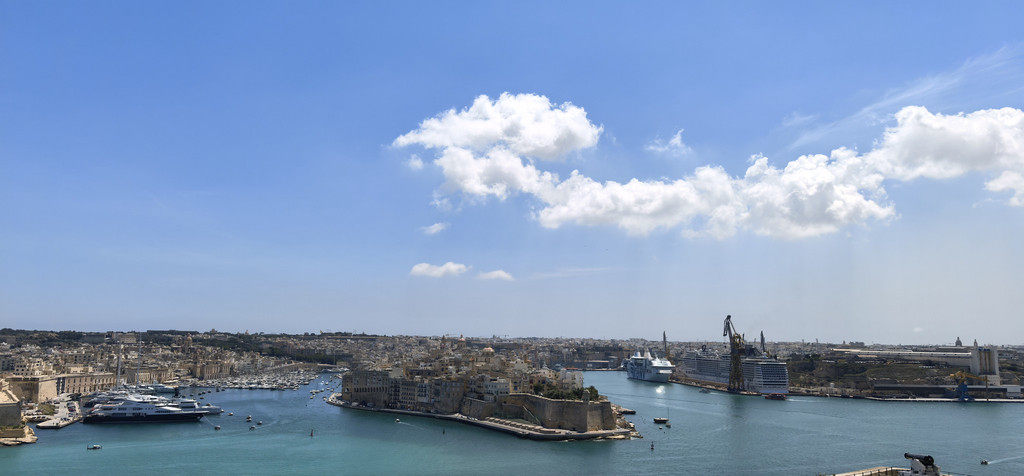 观景台下面是瓦莱塔港,港口里停着的邮轮。