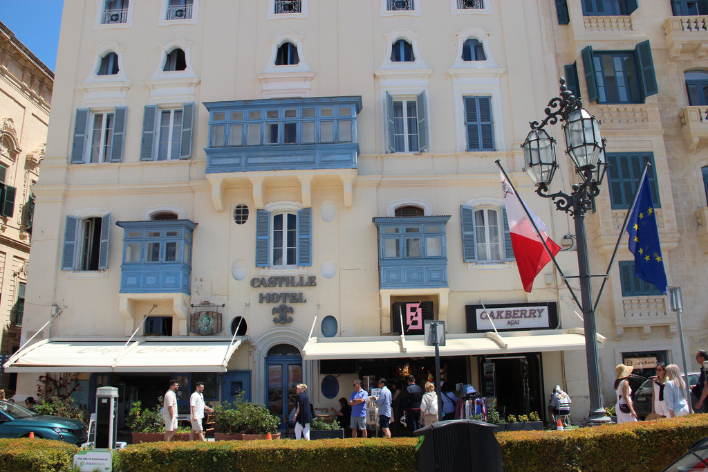 广场边上这栋美丽的巴洛克式建筑是瓦莱塔总理府,叫卡斯蒂利亚宫,建于1740年,前身最早曾是一个叫做卡斯蒂利亚旅馆(或客栈)的建筑,专门安置来自世界各地的骑士。曾经被法国、英国军队当作总部。1972年成为马耳他总理府。