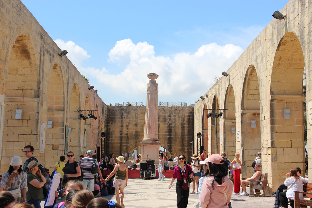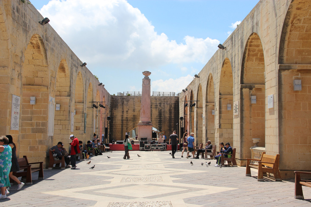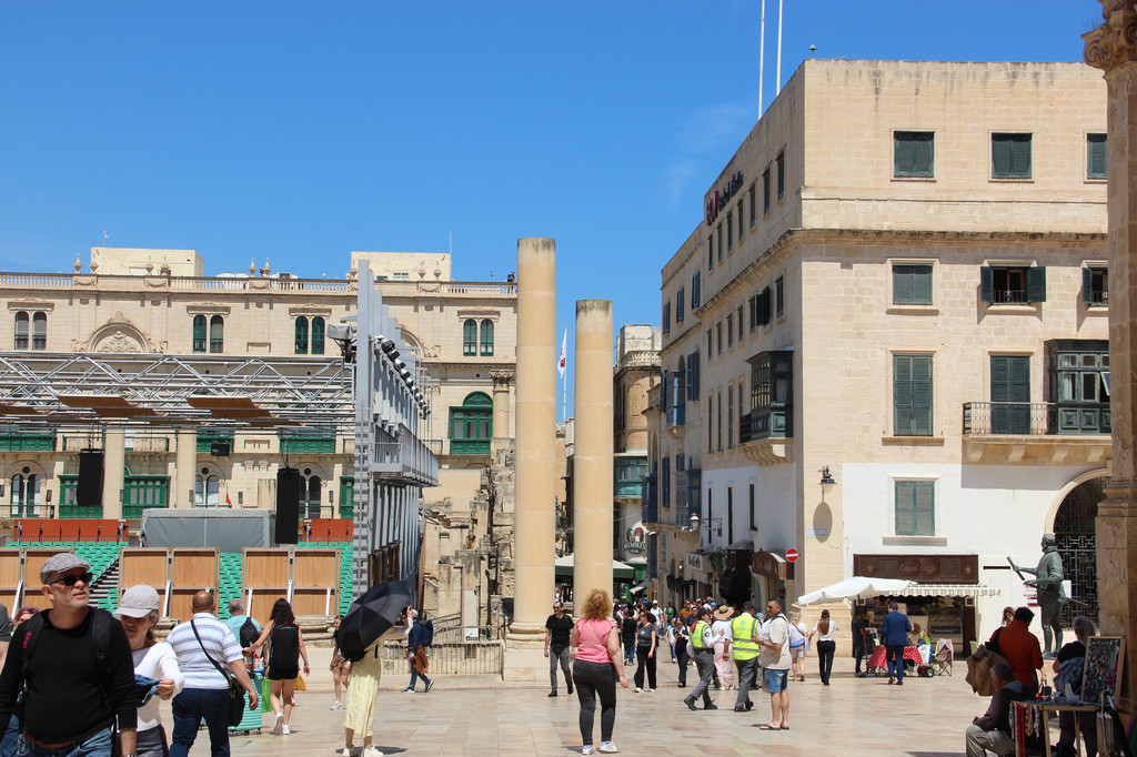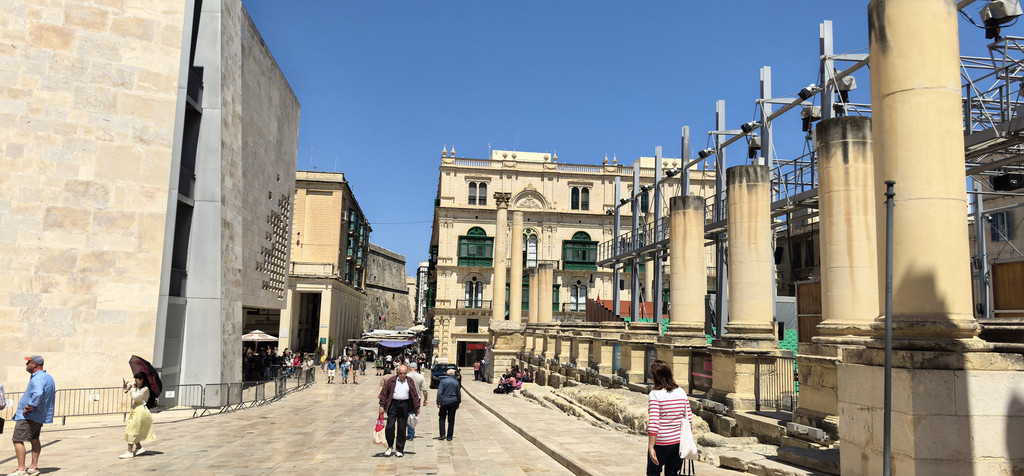 进入共和国街马上就经过一个有罗马柱耸立、设在废墟上的露天剧场。这是瓦莱塔歌剧院遗址,建于19世纪60年代。剧场曾经是瓦莱塔的地标性建筑,希腊神殿式的外表气势恢宏,剧场内有1095个座位。然而1942年的一颗重磅炮弹,让剧场雷鸣般的掌声永远成为过去。如今废墟上搭建的临时舞台,会举办一些庆典或演出。