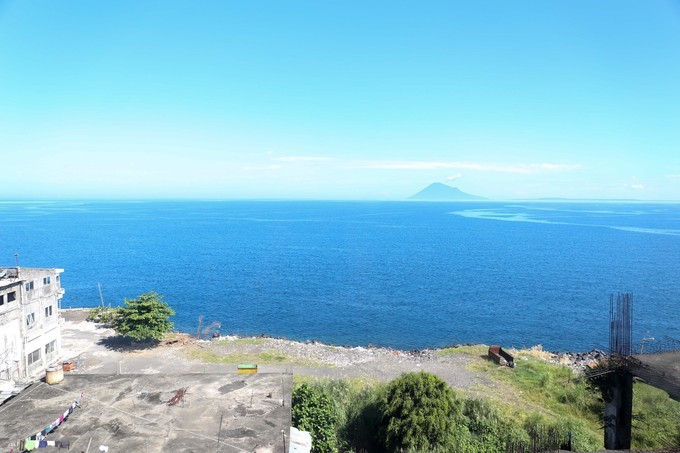 天亮后,拉开窗帘,从房间看到的景色。远处是 美娜多 的马纳多图阿岛(Pulau Manadotua), 印度尼西亚 北苏拉威省 美娜多 的一座火山岛。