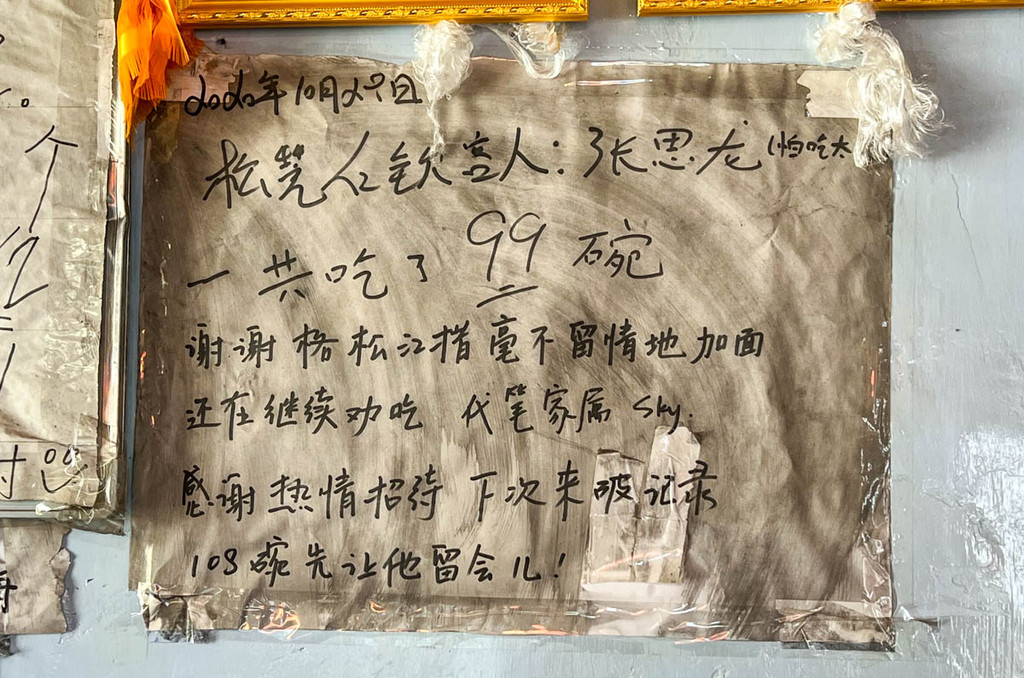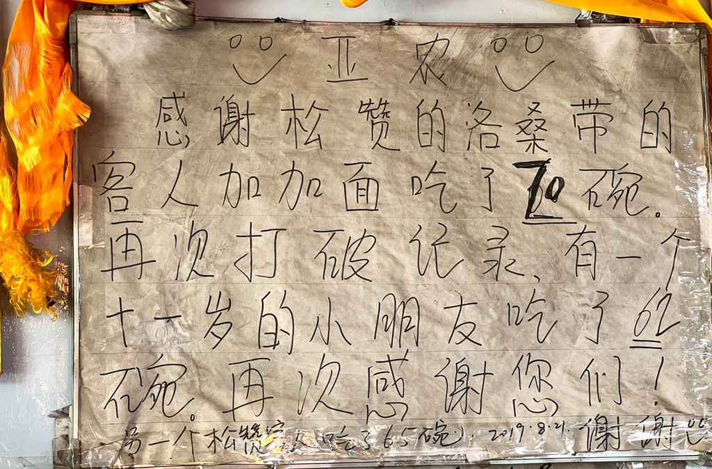 在主人家的墙上,我们看到有很多手写的文字,全都是在这里吃得比较多留下的用餐记录,比如一位叫张思龙的朋友吃了99碗,一位加松赞的朋友吃了79碗,一位11岁的小朋友吃了62碗,据说若能打破这个记录,不仅用餐不用钱,还会奖励十头牦牛,你吃得越多,主人越高兴。