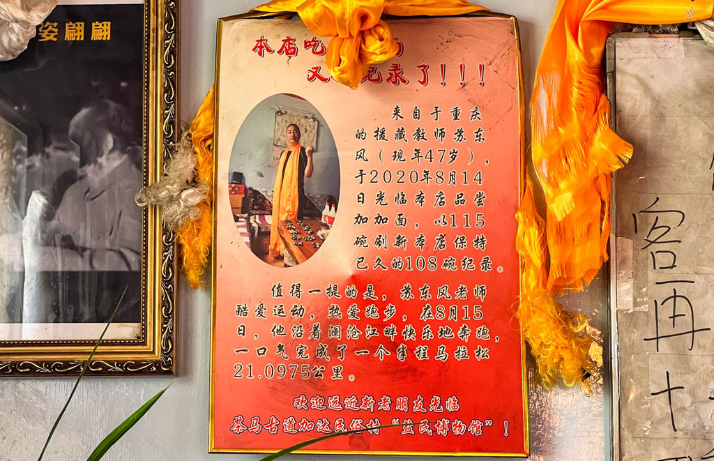 截止目前,到他们家里吃得最多的人是一位重庆到西藏援藏的老师,名叫苏东风,47岁,2020年8月14日在他们家吃了115碗加加面,刷新了他们家之前保持已久的18碗的记录,据说这位老师是一位运动达人,2020年8月15日(也就是在他们打破记录的第二天)沿着澜沧江跑了一个半程马拉松(21.0975公里),要知道那可是高原呀,还敢跑马拉松,真是强人。我们问主人苏老师打破纪录,奖励了什么,得到的回答是,保密,要是你们也能打破记录就告诉你们,绝对会是一个大惊喜。