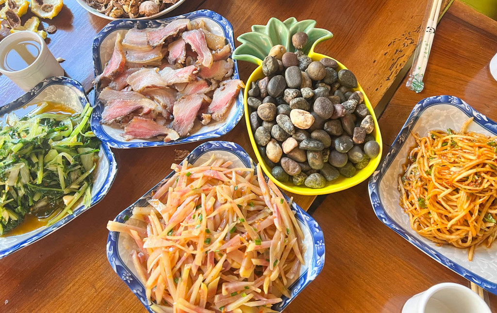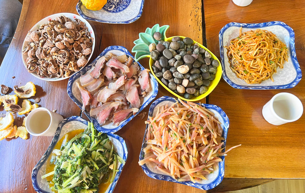 当天我们在千年古盐田游玩之后,便在一位当地朋友的介绍下,前往当地藏族同胞家用午餐,它们家与我们平常想象的西藏农家颇为不同,家的后院还种有绿色的蔬菜,主人非常热情,迎我们进家门,给我们倒酥油茶,但是用餐的时候,却首先给我们端一盘石子,并且放在最中间,我们一时搞不清状况,同行的朋友以为是可以吃的,拿一颗在手上仔细端详,发现确实是石子,用牙齿咬一咬,根本咬不动,差点把牙都咬缺了。