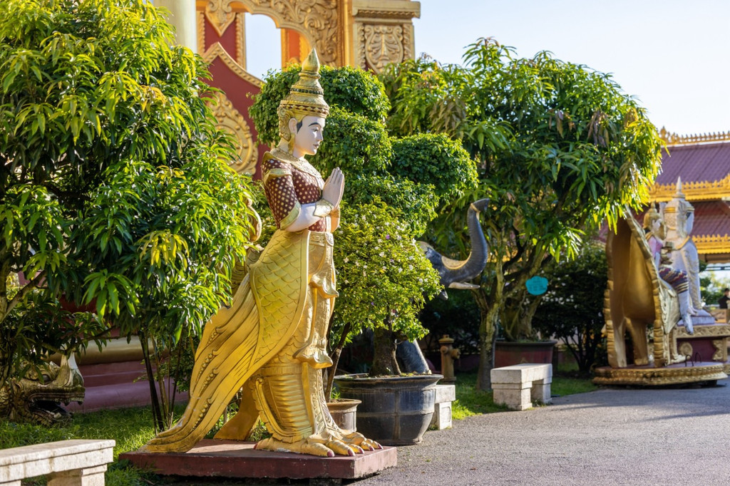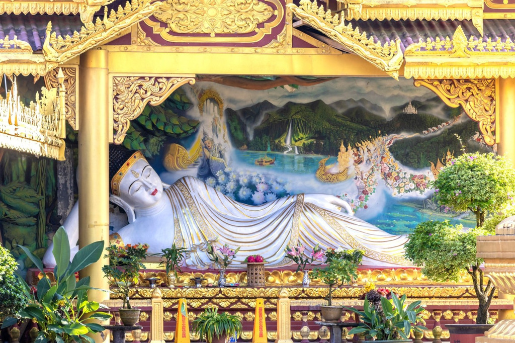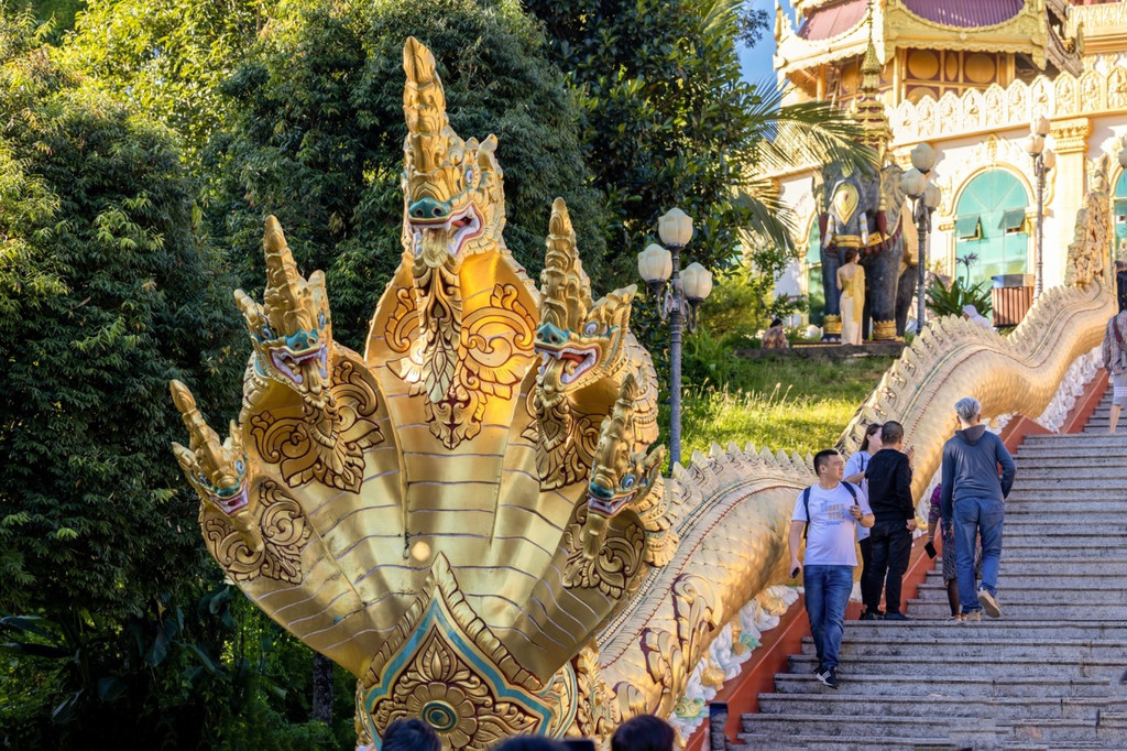 金塔和银塔,一金一银,隔空相望,很多人不知道芒市,却见过金银两塔的影像,它们是芒市代表性建筑,一起矗立在雷崖山之巅、孔雀湖之畔,一个雍容华丽,一个典雅素静,仿佛在诉说一段久远的故事。 勐焕大金塔金灿灿非常华丽,它是亚洲第一空心佛塔,在芒市的各个角落都能看到它,位于芒市城区的雷牙让山之巅,海拔1079.6米,传说释迦牟尼生前转世为金鸡阿峦时曾生活于此。塔造型属于南亚傣王宫的建筑风格,感觉像到了泰国。听说傣族人喜欢将家里值钱的东西卖了,然后为塔涂上金粉,以示虔诚。