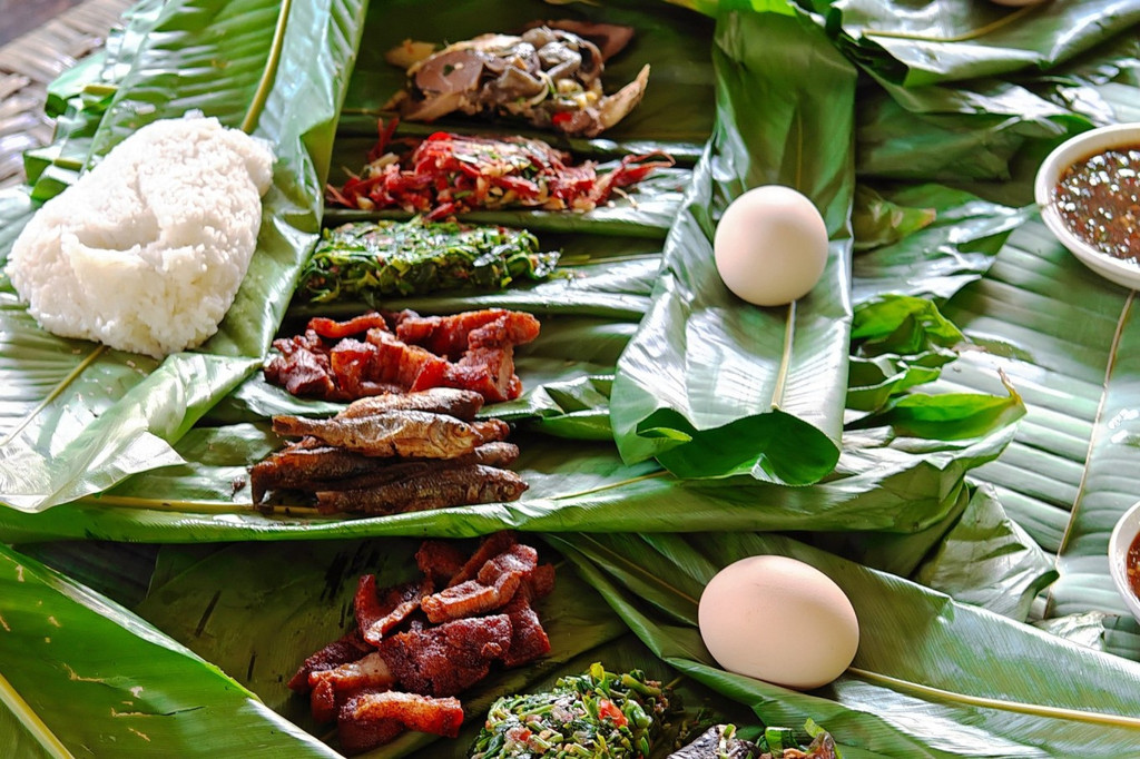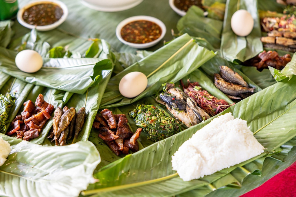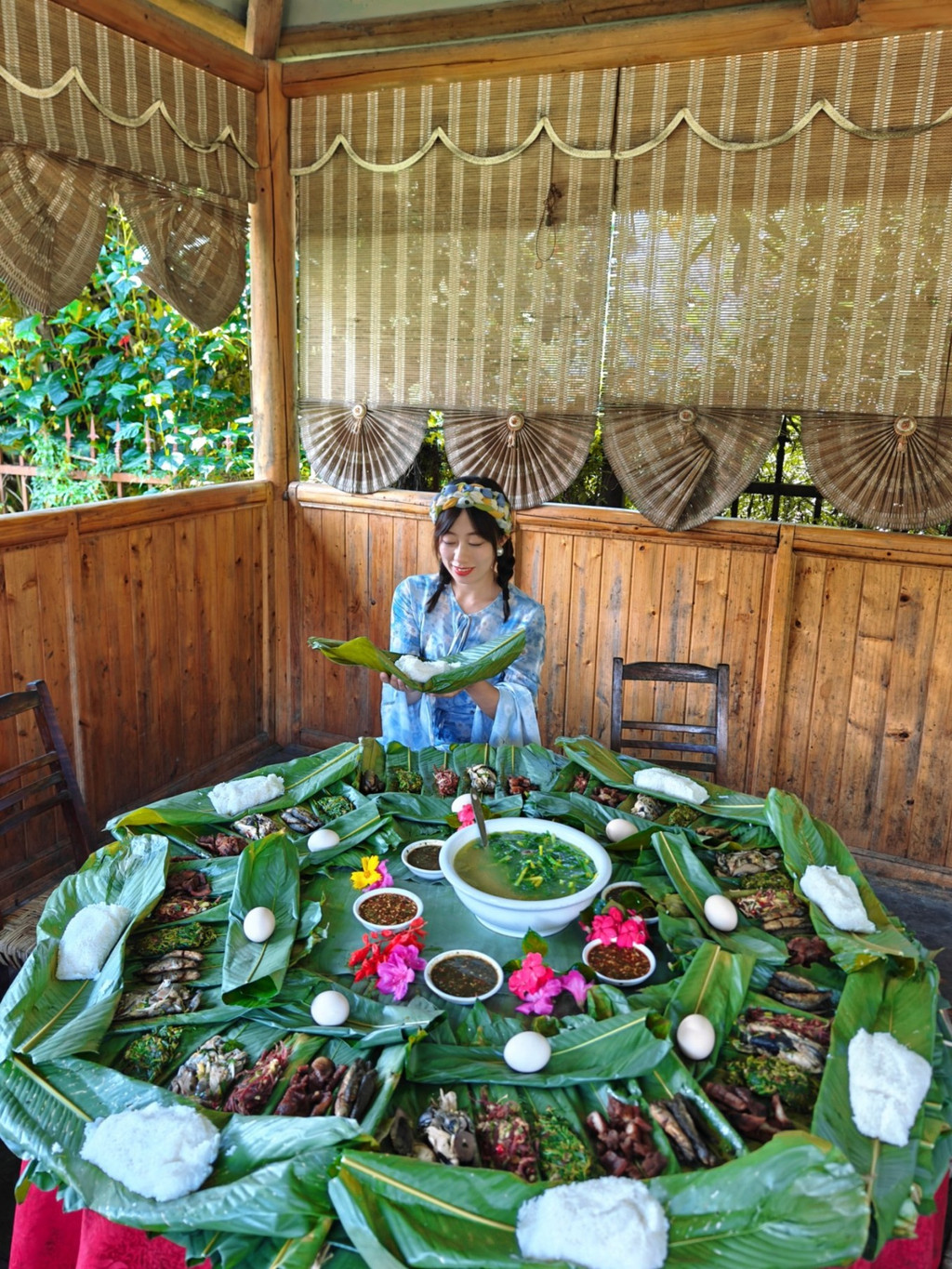 不管你吃过怎样的纯天然绿色食品,绝对没有我将要讲到的天然绿色。来到德宏州的陇川县,陇川,傣语称“勐宛”,意为太阳照耀的地方,陇川也是中国景颇族和阿昌族人口分布最多的县。来这里尝一尝景颇族的传统美式绿叶宴。 进入一个傣族风情的院子,院子里三角梅盛放,吃饭在一个竹亭里面,只见绿油油的叶子铺满了桌子,上面摆着各种花花绿绿的食物。这生机勃勃的一大桌,没有器皿,吃饭不用筷子勺子,饭是竹筒烧的,菜是竹筒舂的,芭蕉叶用来盛菜和饭,竹筒装水米酒,捏一小团饭配着菜吃,米饭越捏越软,放之整个天然美食界也是相当炸裂的存在。 这样的饮食,从元、明史籍中就有明确的记载,写“食无器皿,以芭蕉叶籍之”和“食不用筷”“撵成团而食”的记载,而这样的古老美食依然是当地人的日常风味。