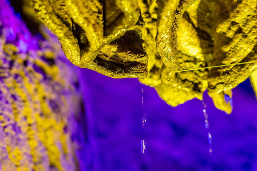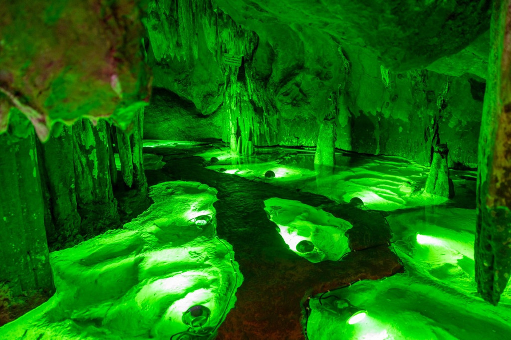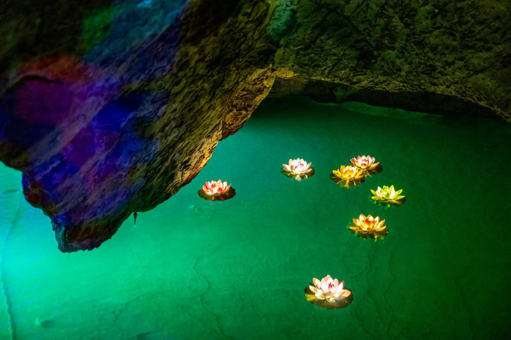 仙佛洞属中生代侏罗系中统勐戛组石灰岩地质构造,已有1.4亿多年的历史 ,顺着石阶前行,钟乳石层层而上,遇见一朵朵石莲盛放,绿色灯光打亮的翡翠瑶池如玉般通透,池水中有鱼,听说洞中鱼因为长期生活在昏暗环境中,眼睛已经退化。