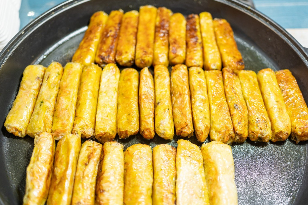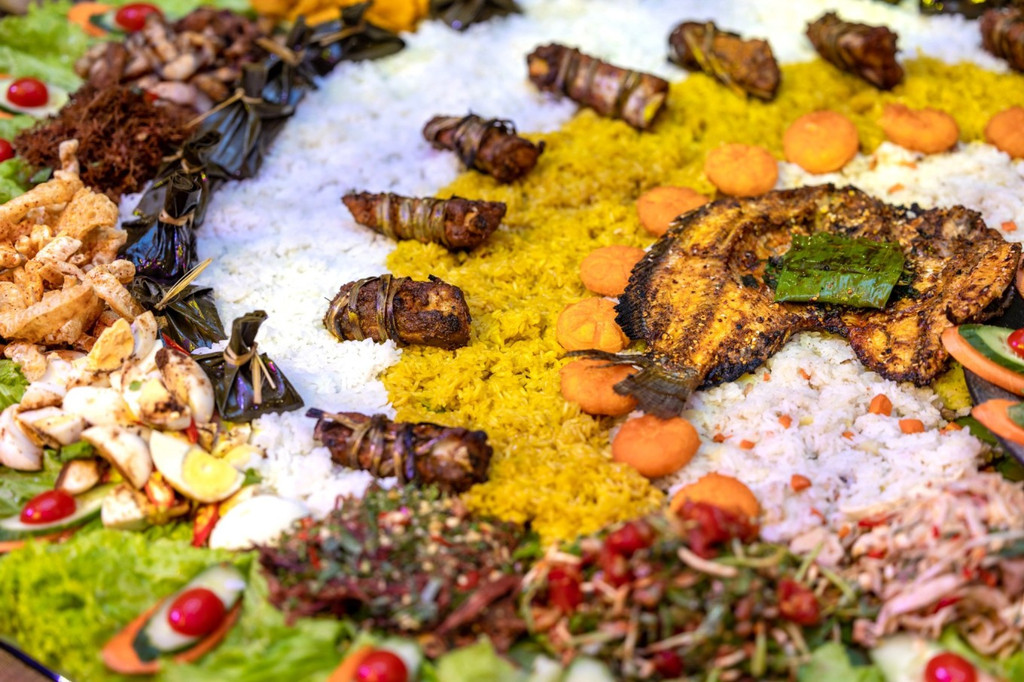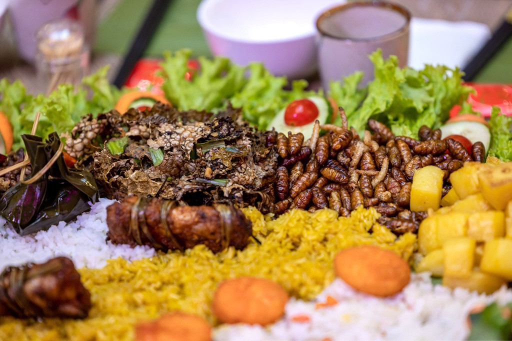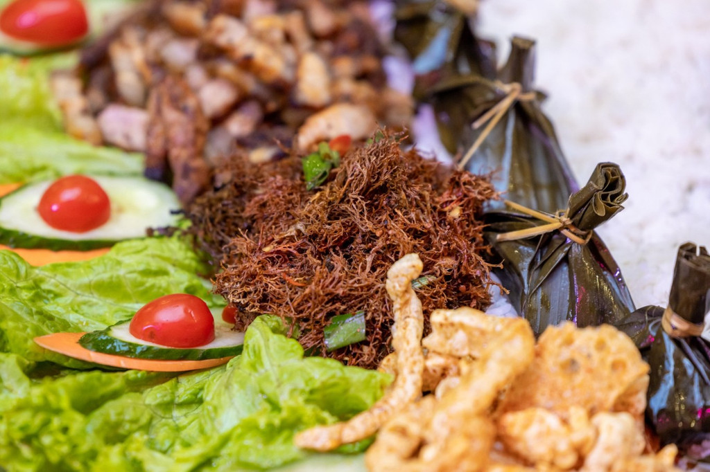 如果说之前吃的绿叶宴已经足够新鲜,那孔雀宴真是让人大开眼界,主打一个啥也没见过,什么都新鲜!真是这句傣族民间谚语说的:“动的都是肉,绿的都是菜”。 德宏气候炎热潮湿,人们喜欢吃酸、辣、苦的味道来除湿清热,又因地处热带、亚热带,食材丰富多样,生食和凉菜都很常见。 孔雀宴用的食材五花八门,摆出一只孔雀开屏的造型,孔雀宴的基本菜品有:烤鸡、火烧鱼、烤五花、柠檬手撕鸡、凉拌折耳根、炸猪皮、包烧金针菇、芒果虾仁、茄子、南瓜饼、菠萝饭等,是傣族人民极受欢迎的食物。 孔雀宴造型完成后,在食材中间加入一些干冰,整只“孔雀”似乎飞翔于云雾缭绕的仙境。戴上手套,抓一点米饭,配合喜欢的食材,捏啊捏,这就是傣家寿司 ,配合20多种菜,可以组合出上几千种组合。