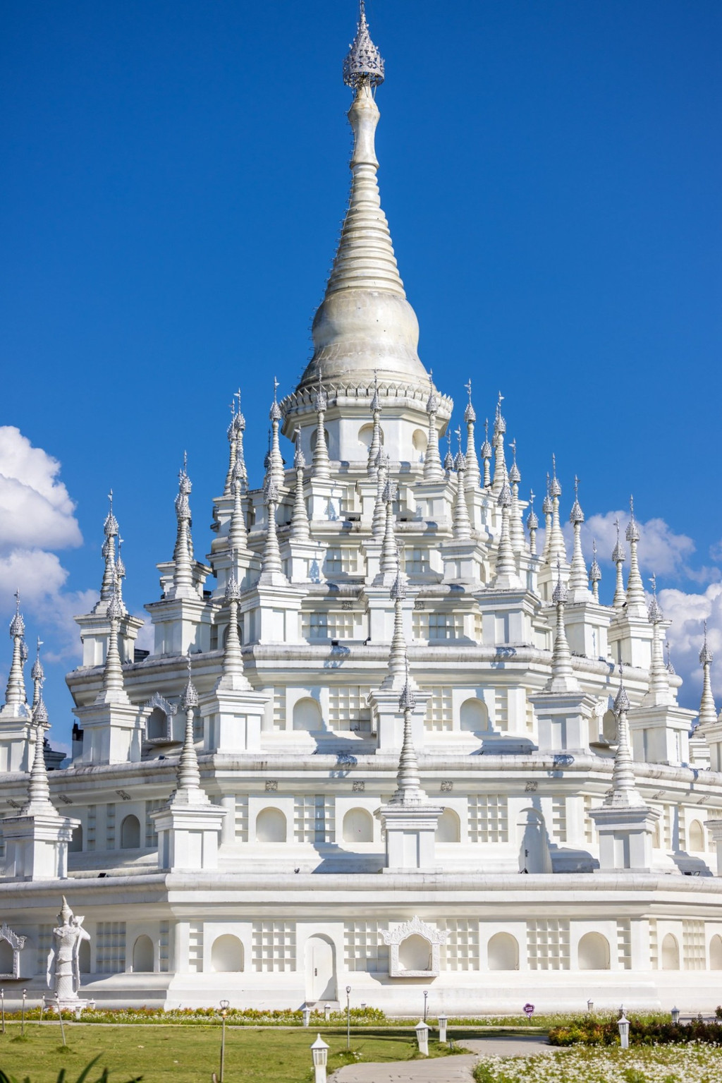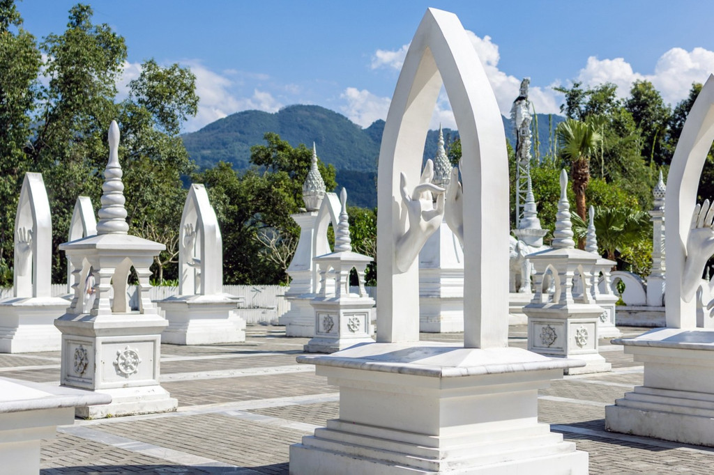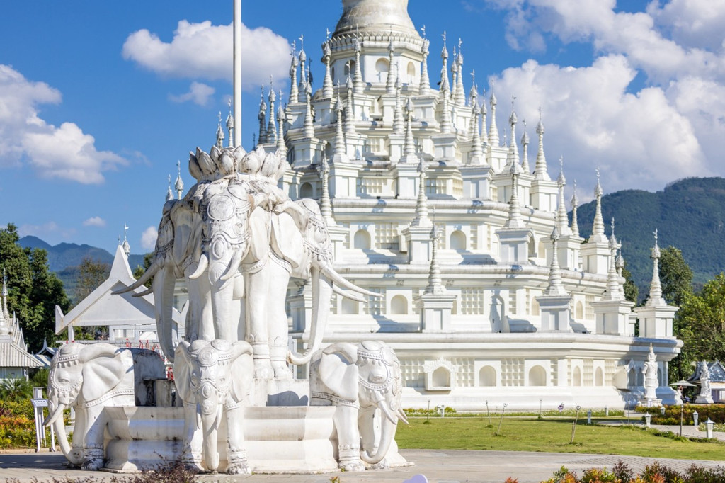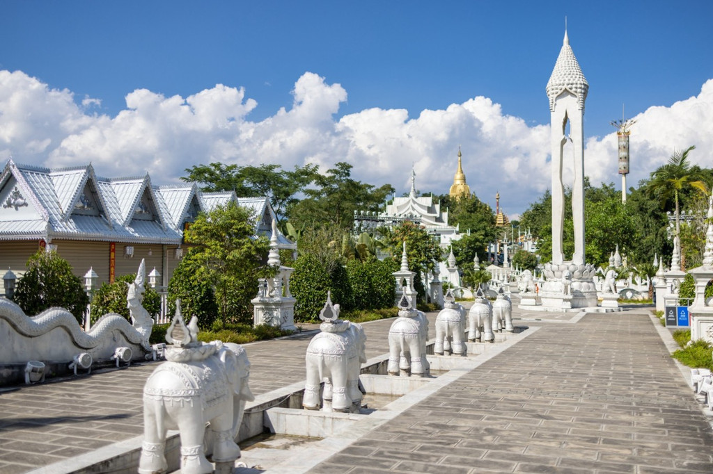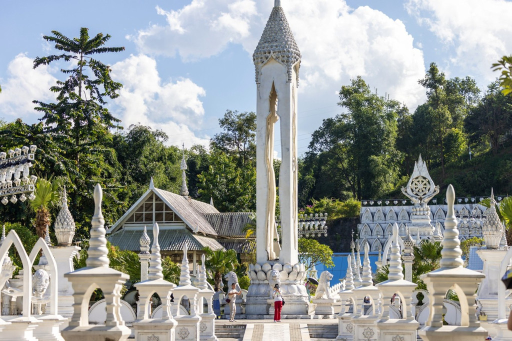 大银塔清冷皎洁的梦幻世界 是在见过勐焕大金塔和银塔后,彻底被芒市迷住了,是什么样的城市啊,物价低,东西好吃,民风淳朴,充满异域风情,多民族文化的汇聚如灿烂星辰,亮到通体发光的银塔和金塔在夜里也熠熠生辉。 银塔是是实心的,无法入内,塔体有一种对称的美,每个塔尖都挂着风铃,风吹来叮叮响,刚一进入银塔园区,就会感到一种不同次元的异域风情,千奇百怪的雕塑造型发着耀眼白光,位于山顶的银塔,是看日落和俯瞰芒市的好地方。银塔以白色为基调,一眼望过去,纯色无染,圣洁庄严,蓝天白云下非常惊艳在泰国银塔给人的感觉素净而低调,隐于金塔后方,像太阳和月亮。