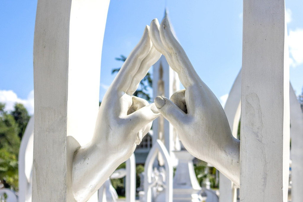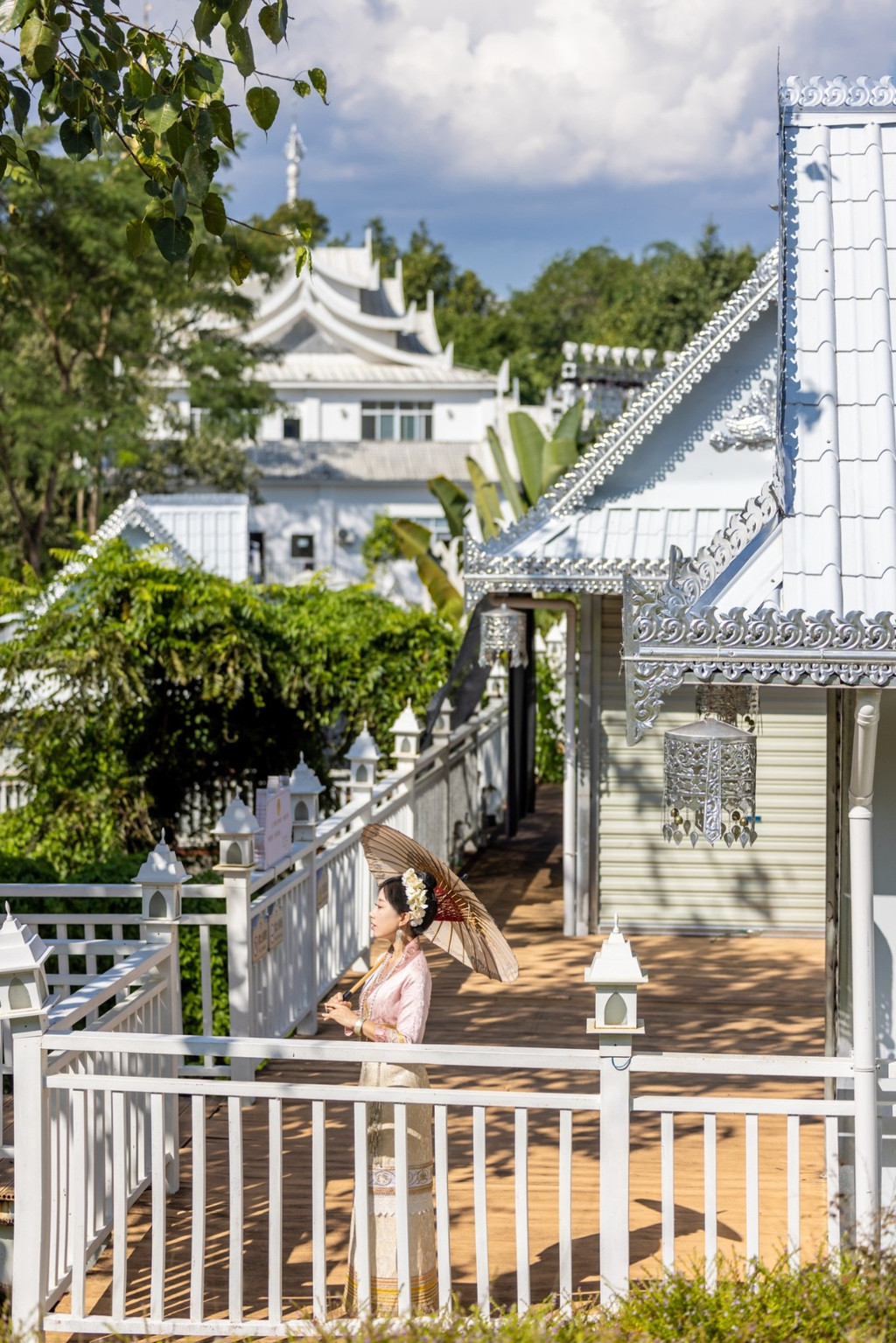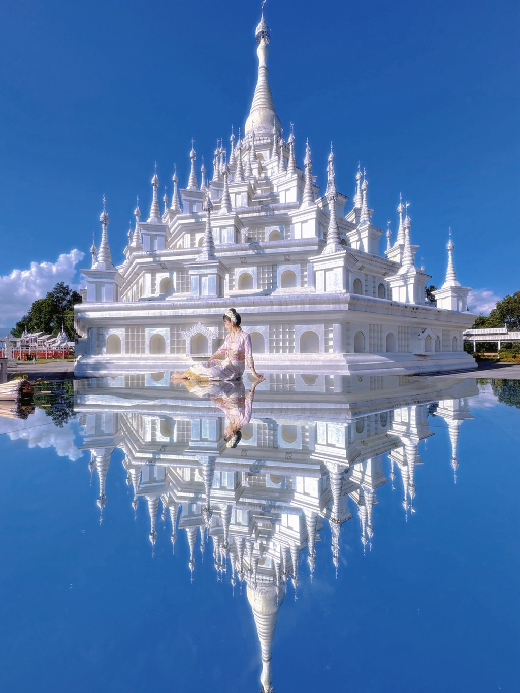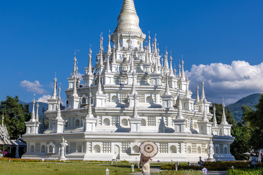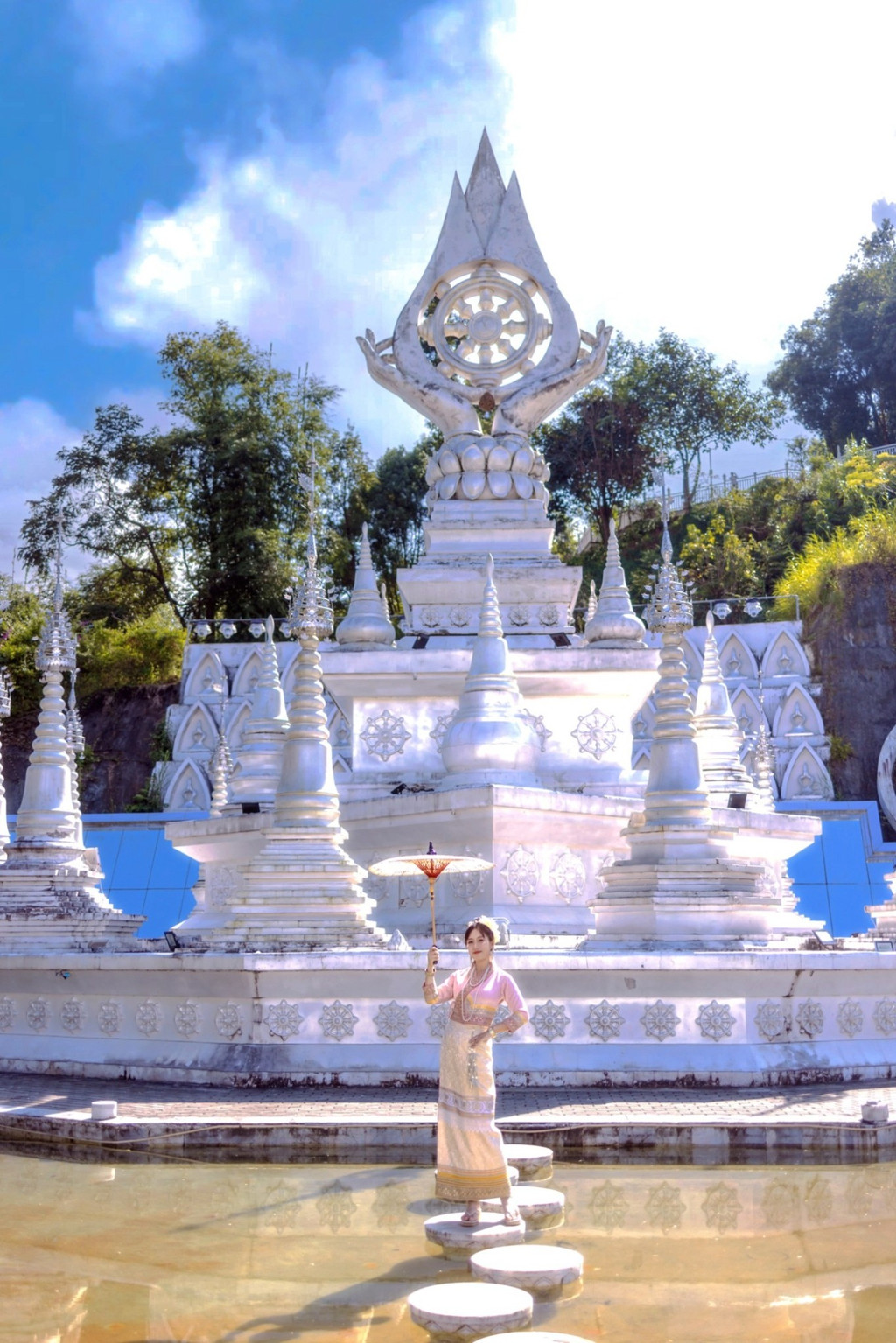 大银塔清冷皎洁的梦幻世界 是在见过勐焕大金塔和银塔后,彻底被芒市迷住了,是什么样的城市啊,物价低,东西好吃,民风淳朴,充满异域风情,多民族文化的汇聚如灿烂星辰,亮到通体发光的银塔和金塔在夜里也熠熠生辉。 银塔是是实心的,无法入内,塔体有一种对称的美,每个塔尖都挂着风铃,风吹来叮叮响,刚一进入银塔园区,就会感到一种不同次元的异域风情,千奇百怪的雕塑造型发着耀眼白光,位于山顶的银塔,是看日落和俯瞰芒市的好地方。银塔以白色为基调,一眼望过去,纯色无染,圣洁庄严,蓝天白云下非常惊艳在泰国银塔给人的感觉素净而低调,隐于金塔后方,像太阳和月亮。