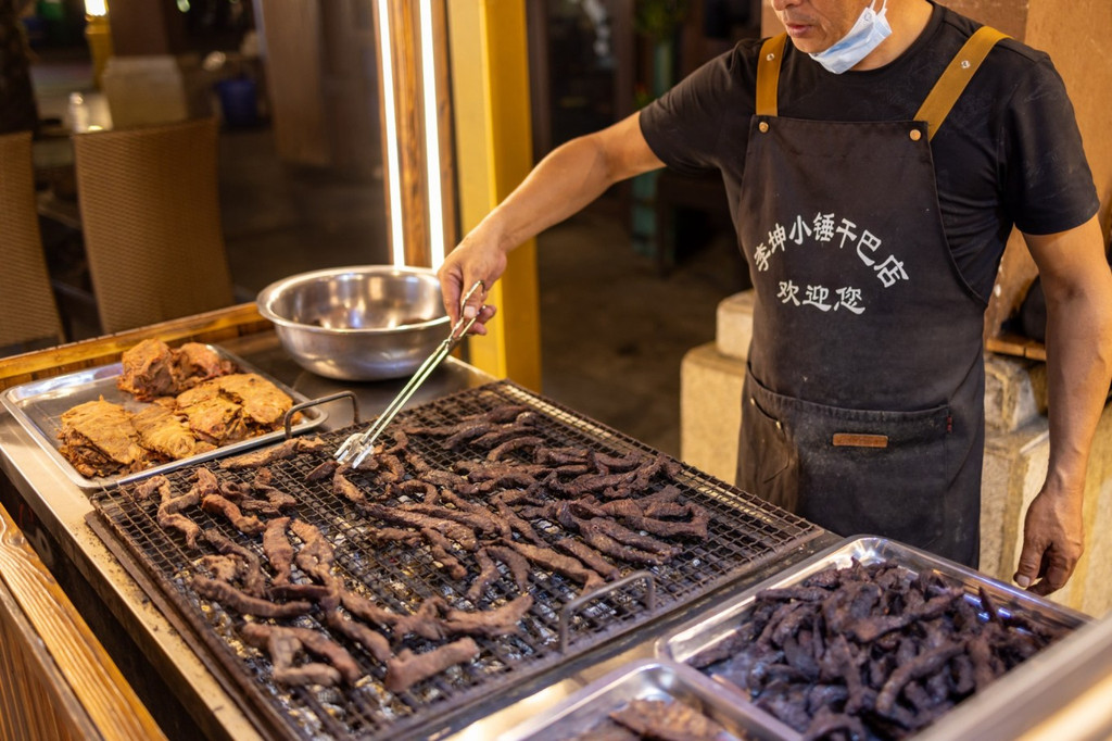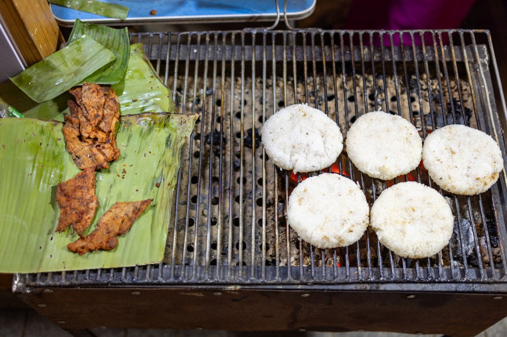 接机的姑娘来了,见面就要带着去吃早餐,芒市的机场和城市没有边界,开车不一会就到市区,到街边米粉店吃粉,店门敞开,屋内屋外摆着低矮桌椅,本地男女老少热闹吃着,点餐先选粉的种类,有宽有细,有干拌有加汤,选了饵丝,粉煮好后,才开始一碗粉注入灵魂的时刻:十多种配菜和佐料令人瞪大眼睛,不同人根据喜好能创造出风味完全不同的口味,认识一个新事物叫山胡椒根,要用小刀刮下粉末加进汤里。辣椒更是各式各样的,有红的绿的,油辣子辣椒面……