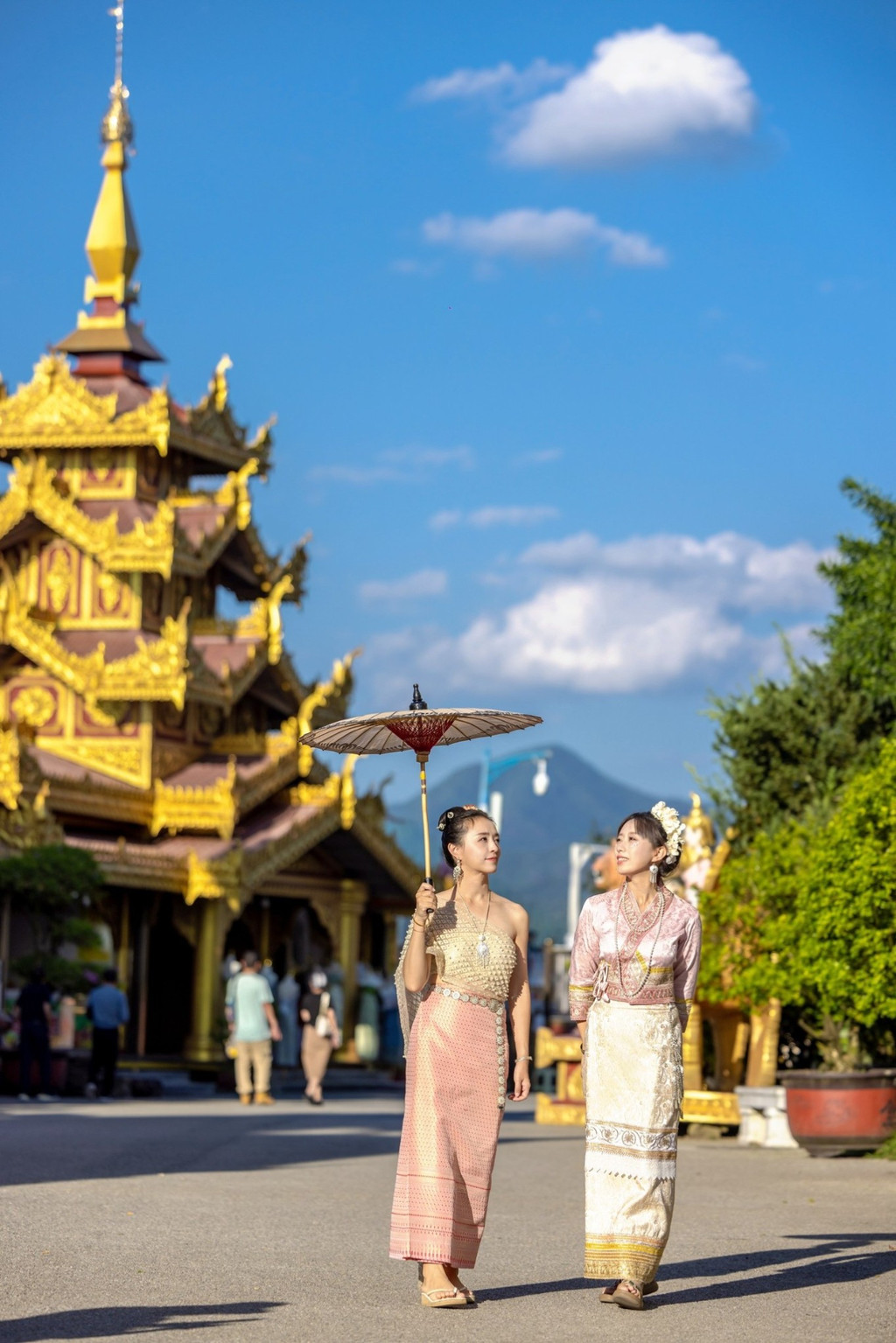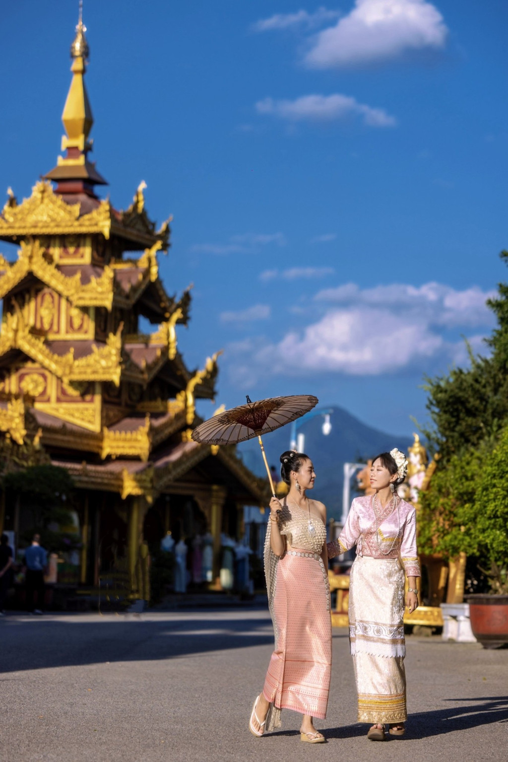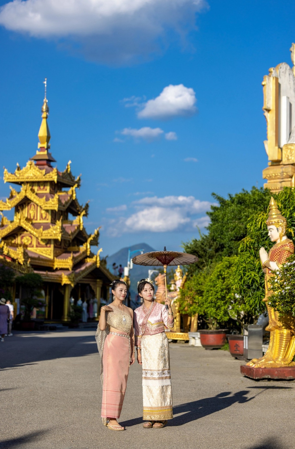 后面几天看看芒市和瑞丽,后劲太大了,只觉得没玩够。 想写一写德宏,但是也不能只写德宏 你要写德宏的夏天永不停歇,要写在德宏的每一天都自由且热烈, 写芒市的勐焕大金塔和银塔亮到通体发光在夜里也熠熠生辉, 写傣族的孔雀宴写景颇族的绿叶宴; 写德宏丰富的地热资源写温泉遍布; 写假装在巴厘岛的度假体验; 写明艳动人的民族服饰,写多民族文化的汇聚如灿烂星辰, 写受东南亚热带季风气候影响像油画一样的云, 写赏不完的日落看不完的大飞机飞过头顶…