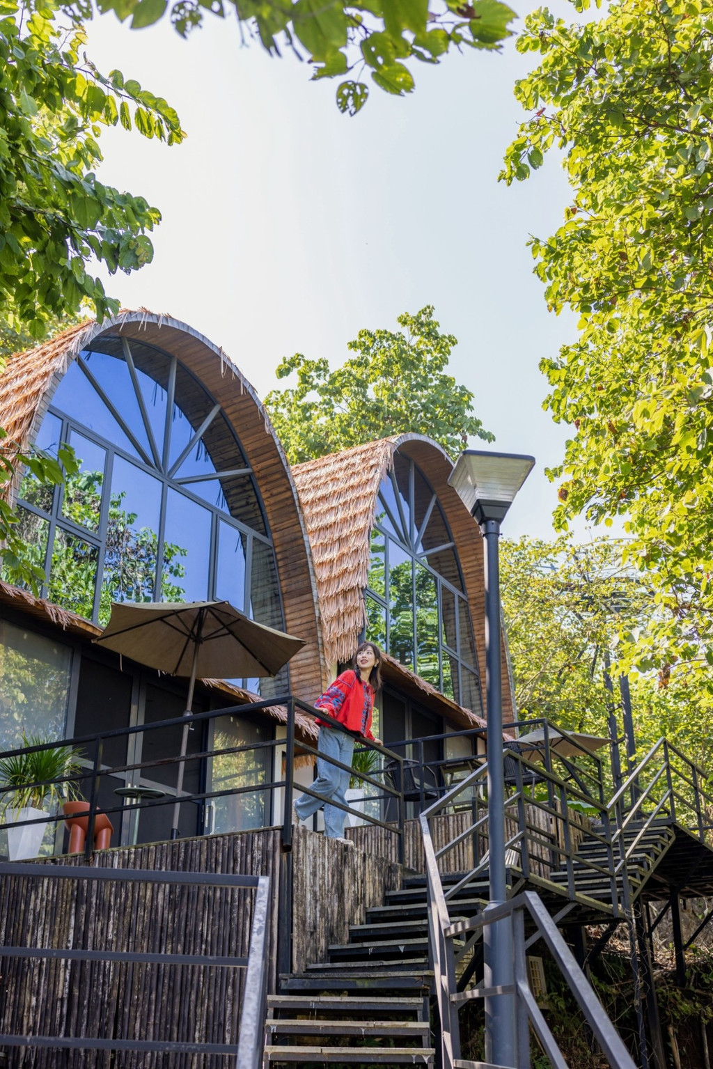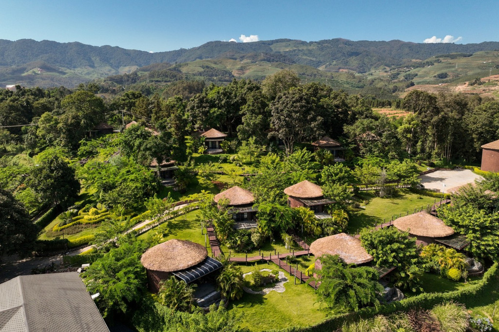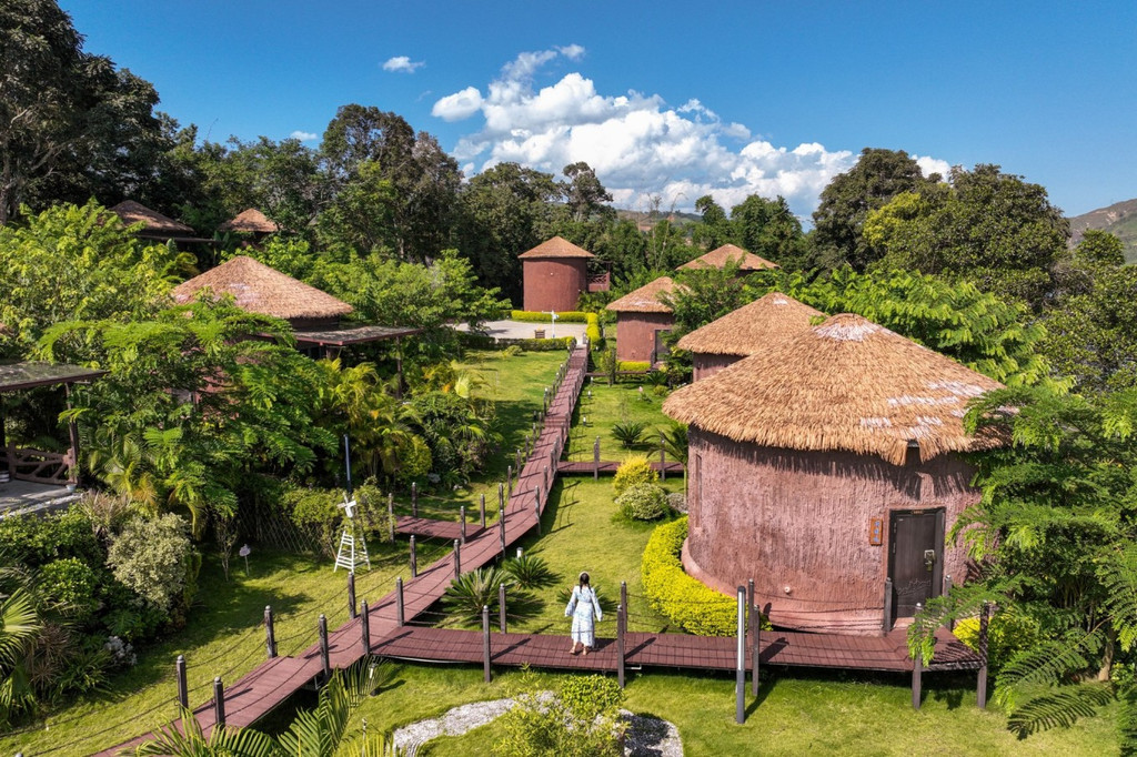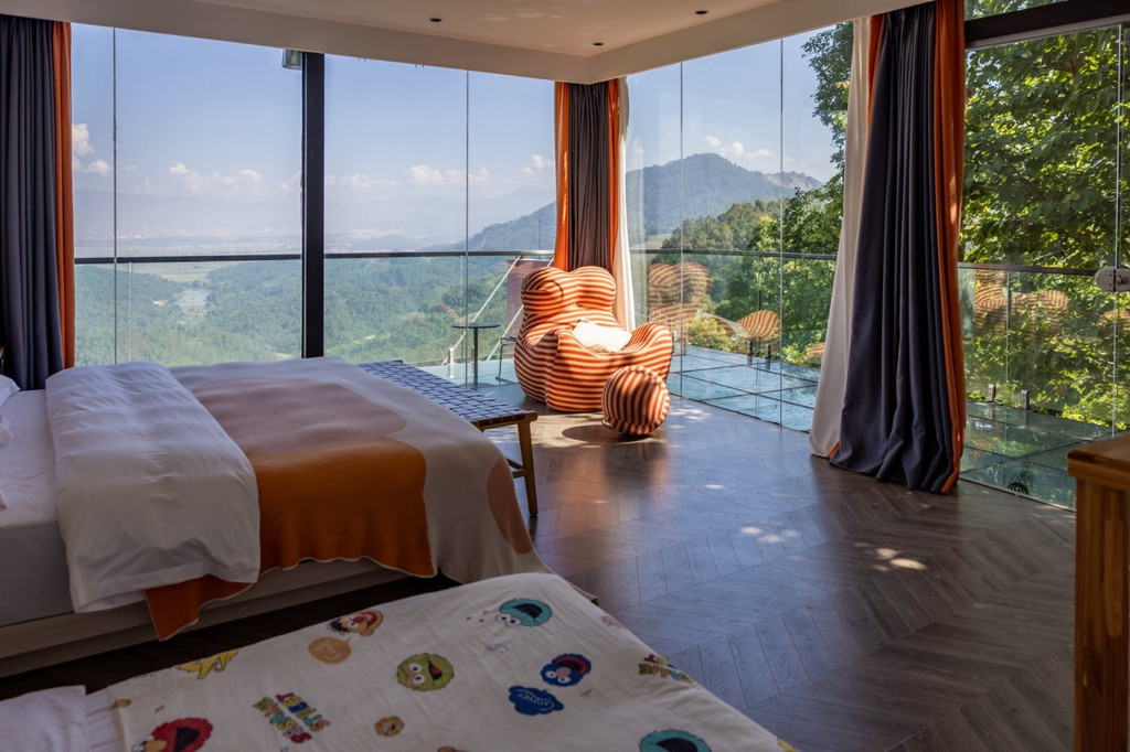 山顶上的半山酒店 在仙佛洞景区还有一间民宿,一座座森林木屋错落于山林间,每一间小木屋的外形特别,建筑为原木结构,民宿坐拥整片溶洞山顶,原始纯真,阳光下仿佛自在生长能自由呼吸,房间里透明落地窗将翠绿山色投映进来,还能看到远处芒市的全城风貌。听说老板花了近两年的时间对这里进行改造建设,目前这里有8间半山全景观独栋别墅,其中有4间还是带独立泡池。