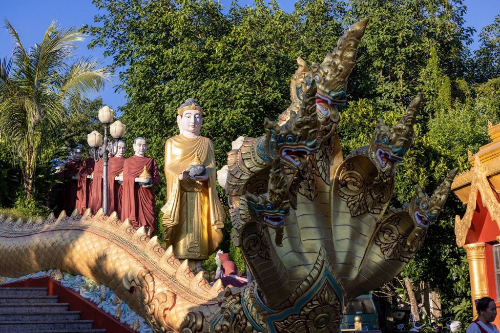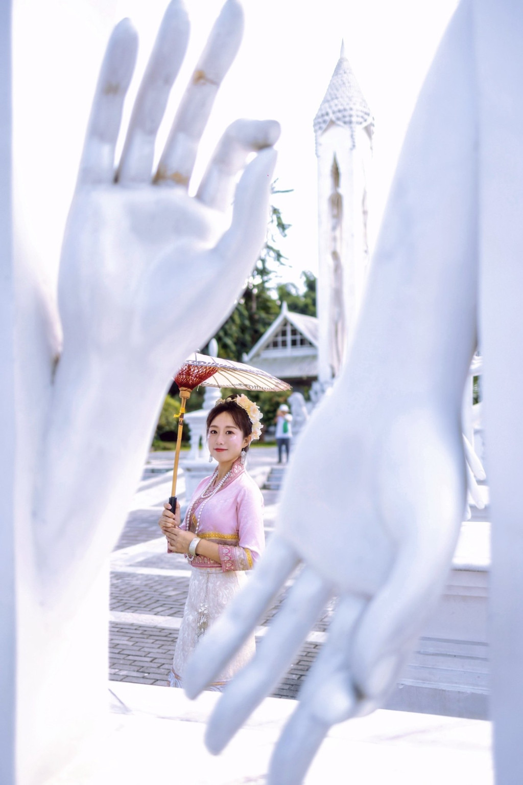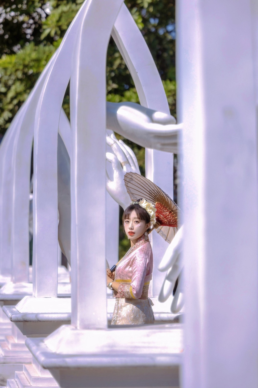 在这个万物凋零的季节,我来到了云南德宏傣族景颇族自治州。走出芒市机场,站在烈日街头,才八点,灿烂炙热的阳光已经淹没了一切,我和万物一样在发着光。 芒市是德宏的首府,全国唯一名字就一个字的县级市,果真城如其名,光芒万丈。眼前出现的金塔充满着异域风情,整齐高大的棕榈树郁郁葱葱,让人忍不住眯着眼抬头看。跨越半个中国来到的地方,感慨祖国地大物博,南北风光各异。脱掉了厚重衣裳,一步跨进德宏的夏天。